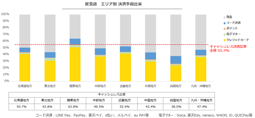 キャッシュレス決済比率は全国で55.7%と、前月から1.4pt増加した。