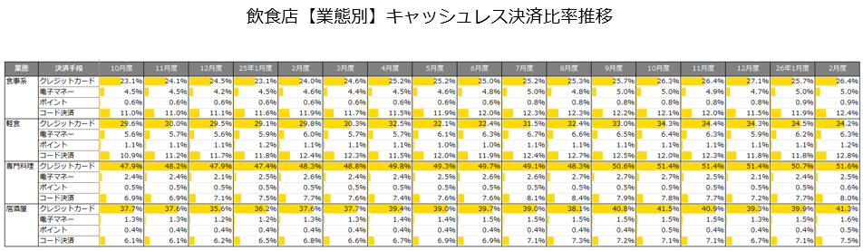 キャッシュレス決済比率は1月度から2月度にかけて、すべての業態で増加した