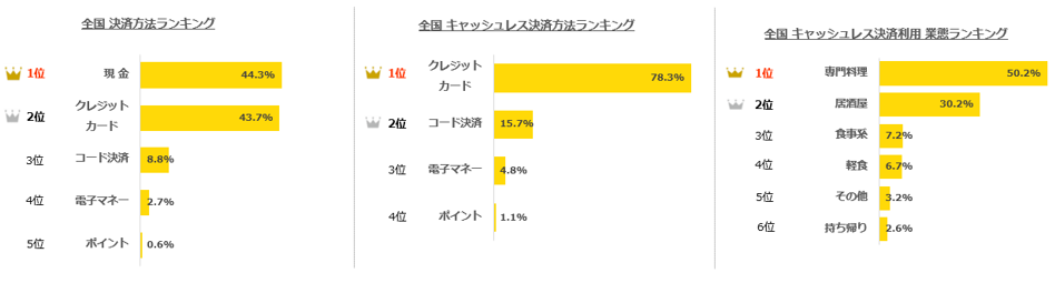 決済方法は、現金が44.3%で前月に引き続き第1位となった。2位のクレジットカードは43.7%とその差は0.6ptとなった。