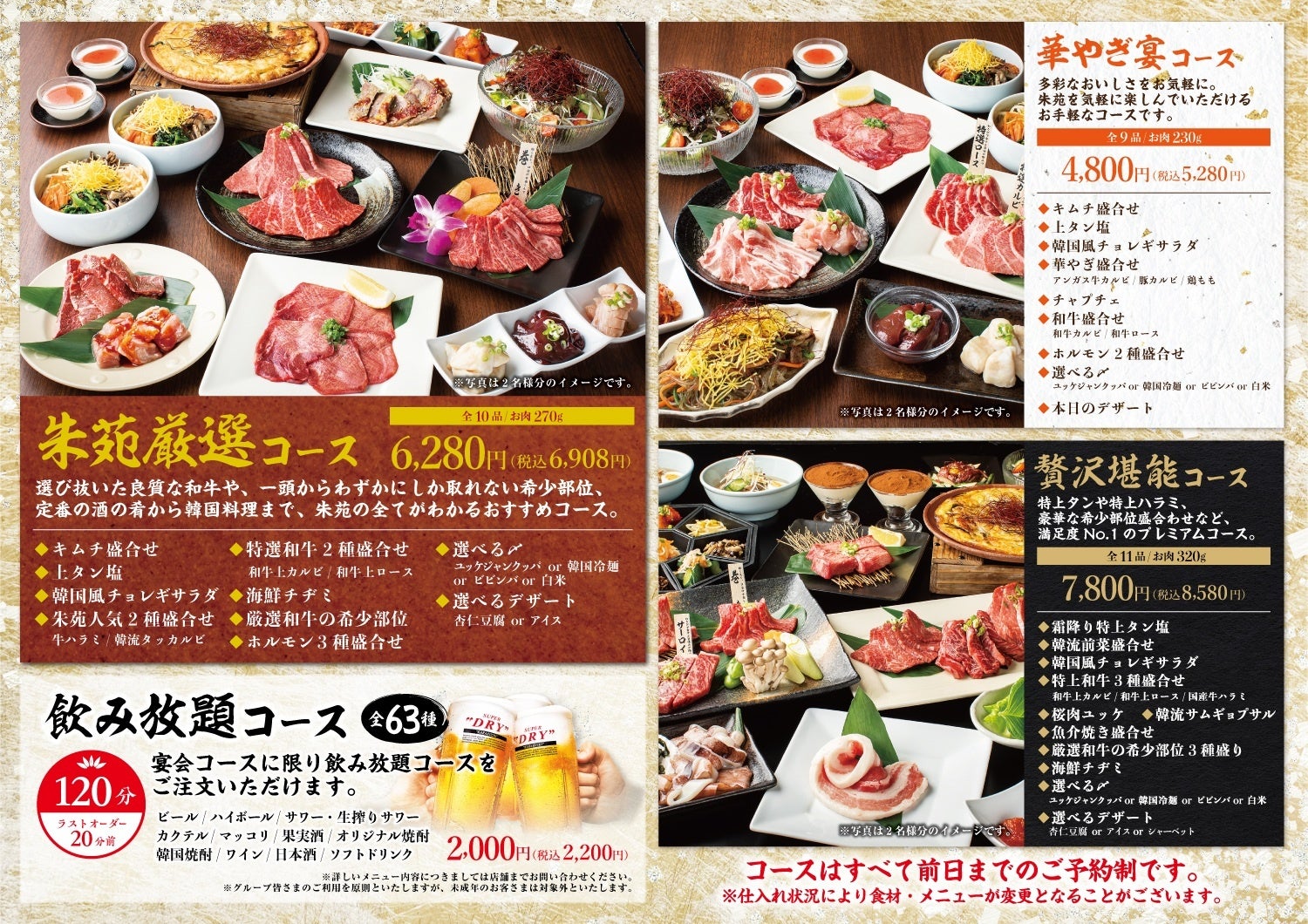 キムチ盛り合わせ/上タン塩/韓国風チョレギサラダ/朱苑人気2種盛り合わせ(牛ハラミ・韓流タッカルビ)/特選和牛2種盛り合わせ(和牛上カルビ・和牛上ロース)/海鮮チヂミ/厳選和牛の希少部位/ホルモン3種盛り合わせ/選べる〆(ユッケジャンクッパor韓国冷麺orビビンバor白米)/本日のデザート