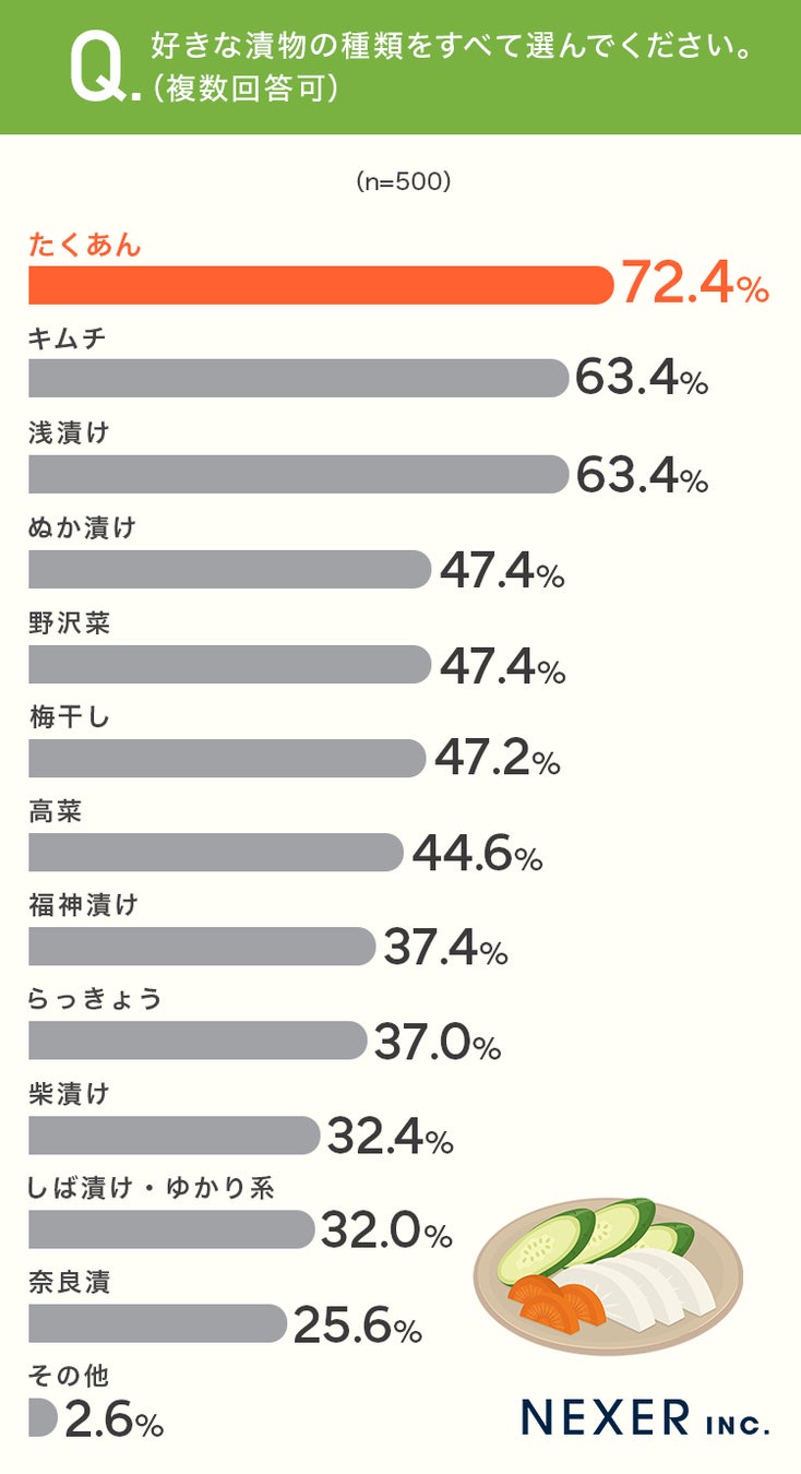 もっとも人気だったのは「たくあん」で72.4%でした。2位と3位は同率で「キムチ」と「浅漬け」がいずれも63.4%、以下「ぬか漬け」と「野沢菜」が47.4%で並び、「梅干し」が47.2%とわずかな差で続きました。