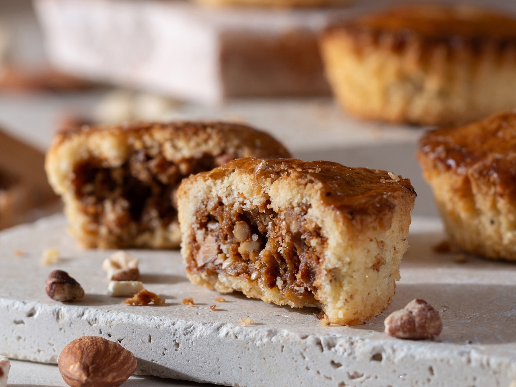 キャラメルとナッツをより、楽しんでいただくために中身はたっぷりと、外の生地は薄めに設計しました。また、絶妙な火加減で焼き上げることによって、サク・ほろ・ふわっとした心地よくほどける食感にこだわり、試行錯誤を繰り返しました。