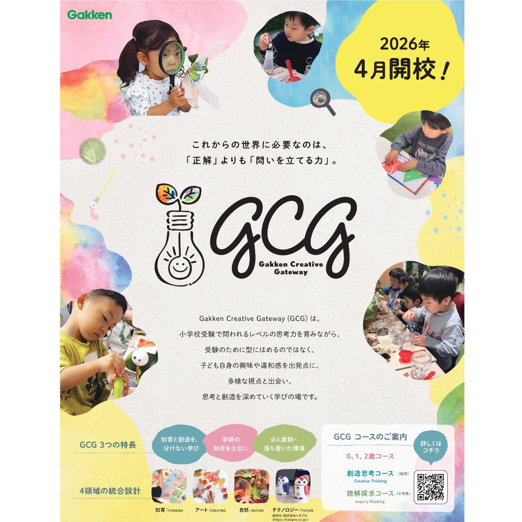 Gakken Creative Gateway(GCG)は、小学校受験で問われるレベルの思考力を育みながら、受験のために型にはめるのではなく、子ども自身の興味や違和感を出発点に、多様な視点と出会い、思考と創造を深めていく学びの場です。子ども一人ひとりの好奇心を大切にしながら、主体的に考え、表現する力を育むプログラムを提供します。