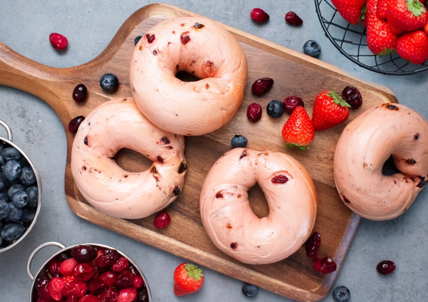 「ストロベリー」「クランベリー」「ブルーベリー」の3種のベリーをごろっと練り込み、シンプルに仕上げたベーグルです。自然な甘さが3種のベリーの存在感を引き立たせ、一口ごとにフルーティーな香りと優しい味わいが口いっぱいに広がります。
