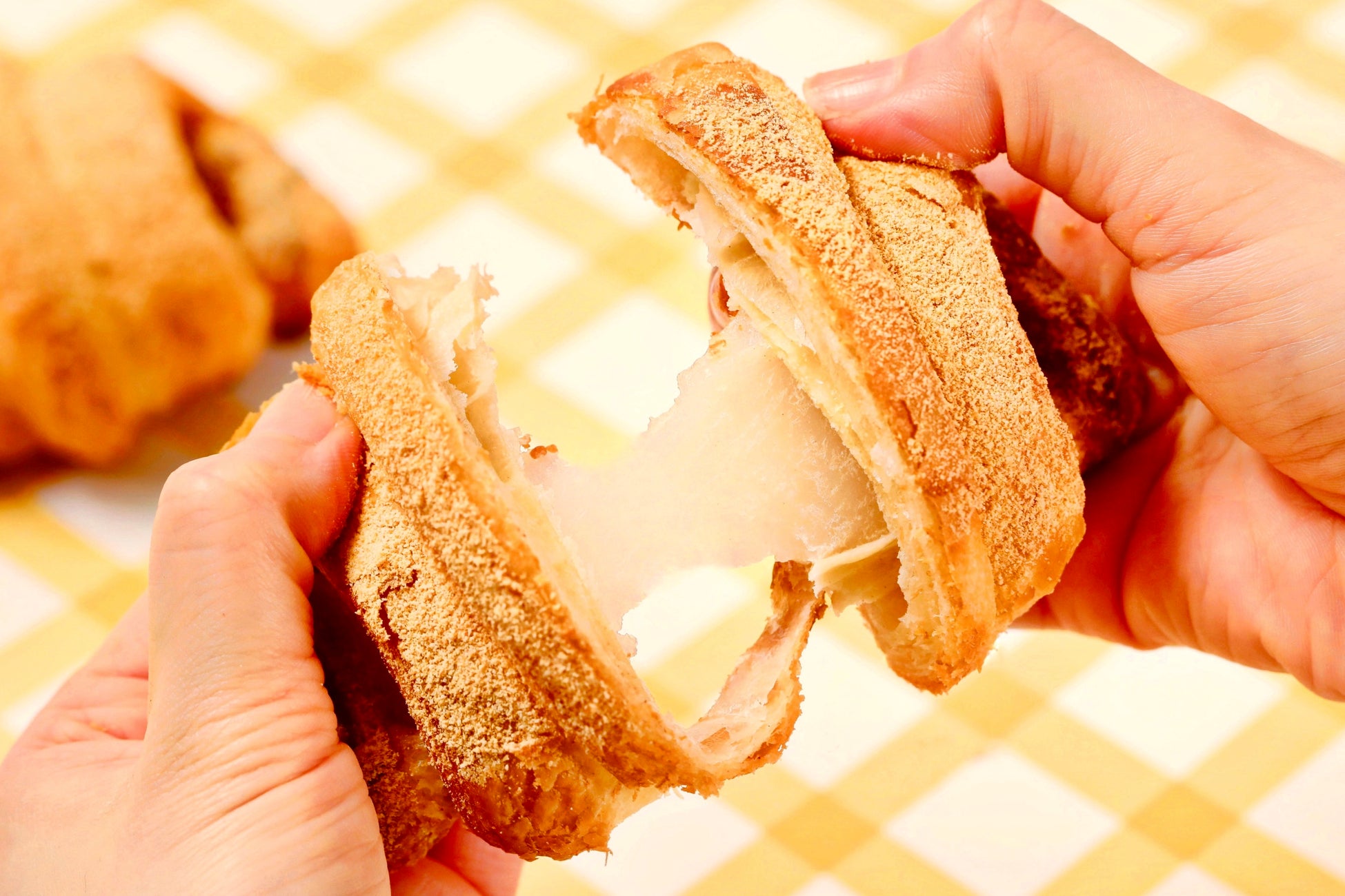 こだわり:クロワッサンのサクサク食感と、もちもちとした餅の弾