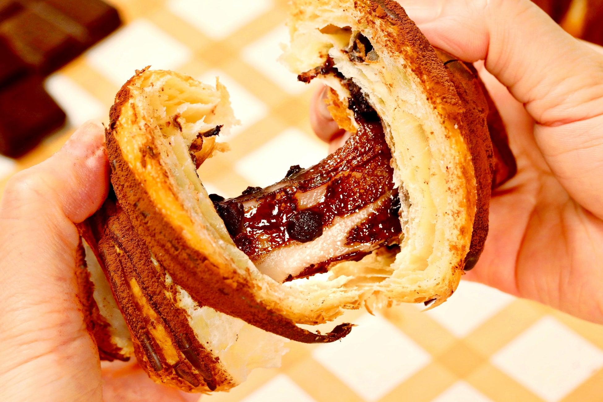 プレーン生地を重ねて、ぐるぐる模様に焼き上げました。チョコのまろやかな甘みに、弾力