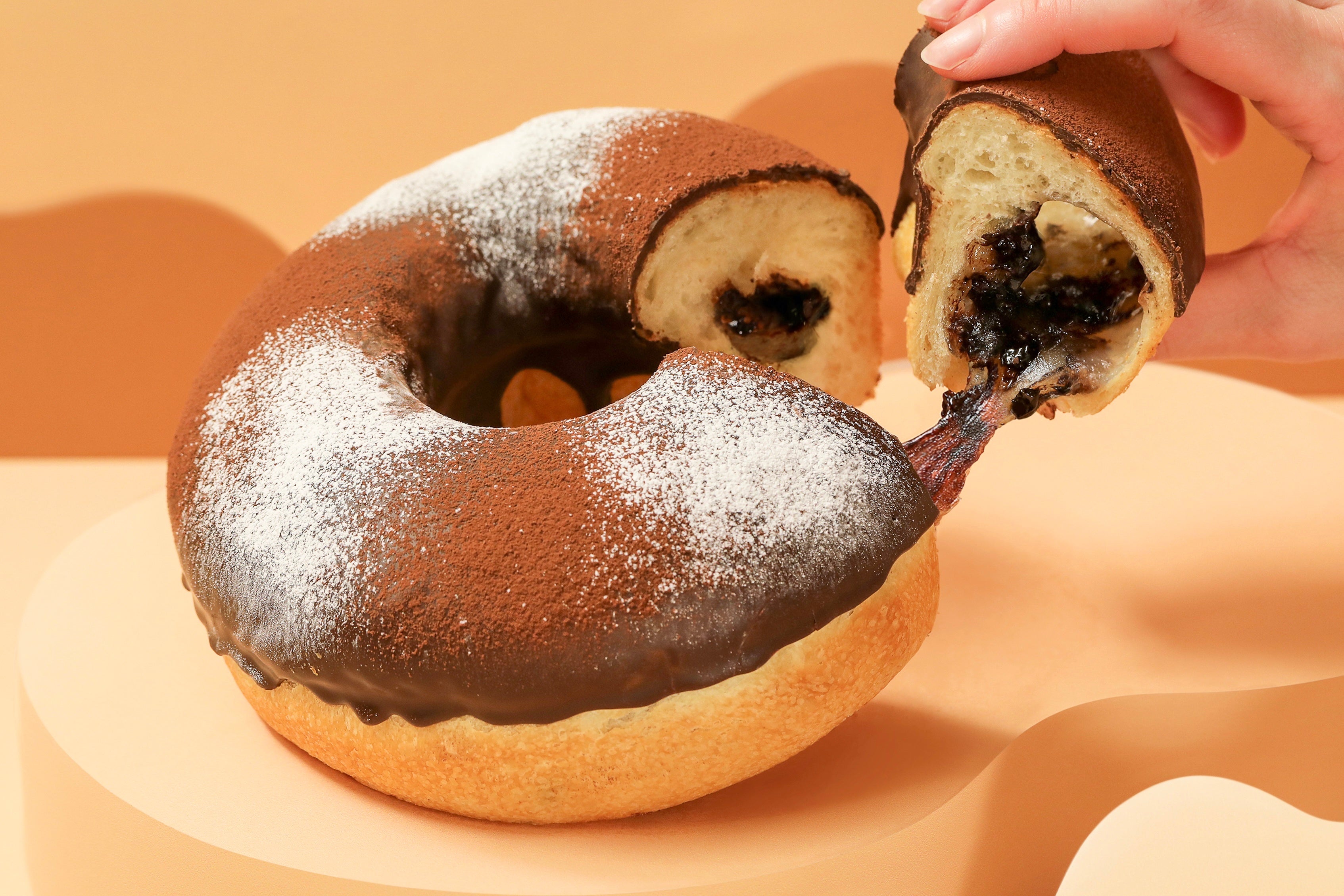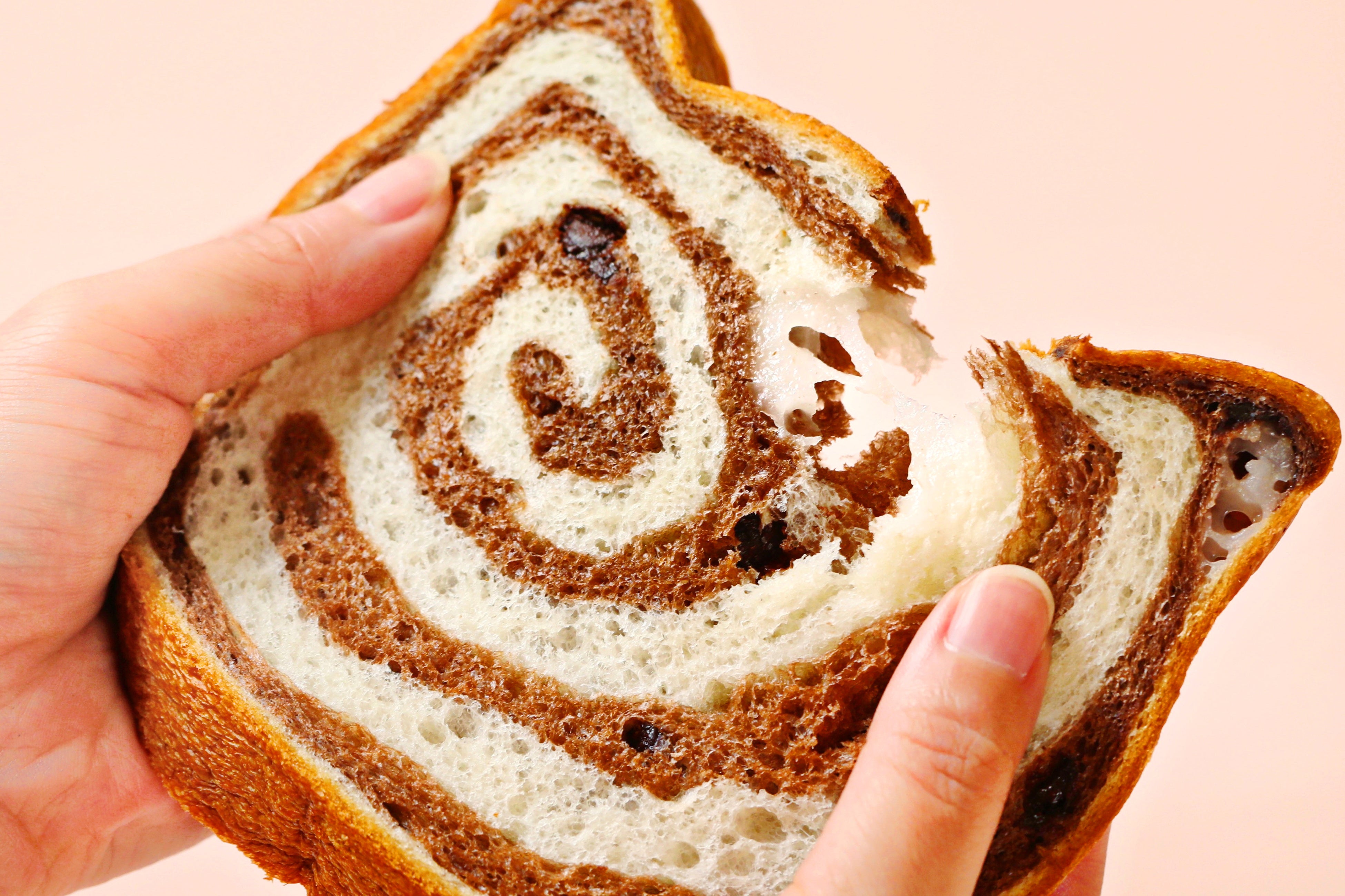 プレーン生地を重ねて、ぐるぐる模様に焼き上げました。チョコのまろやかな甘みに、弾力