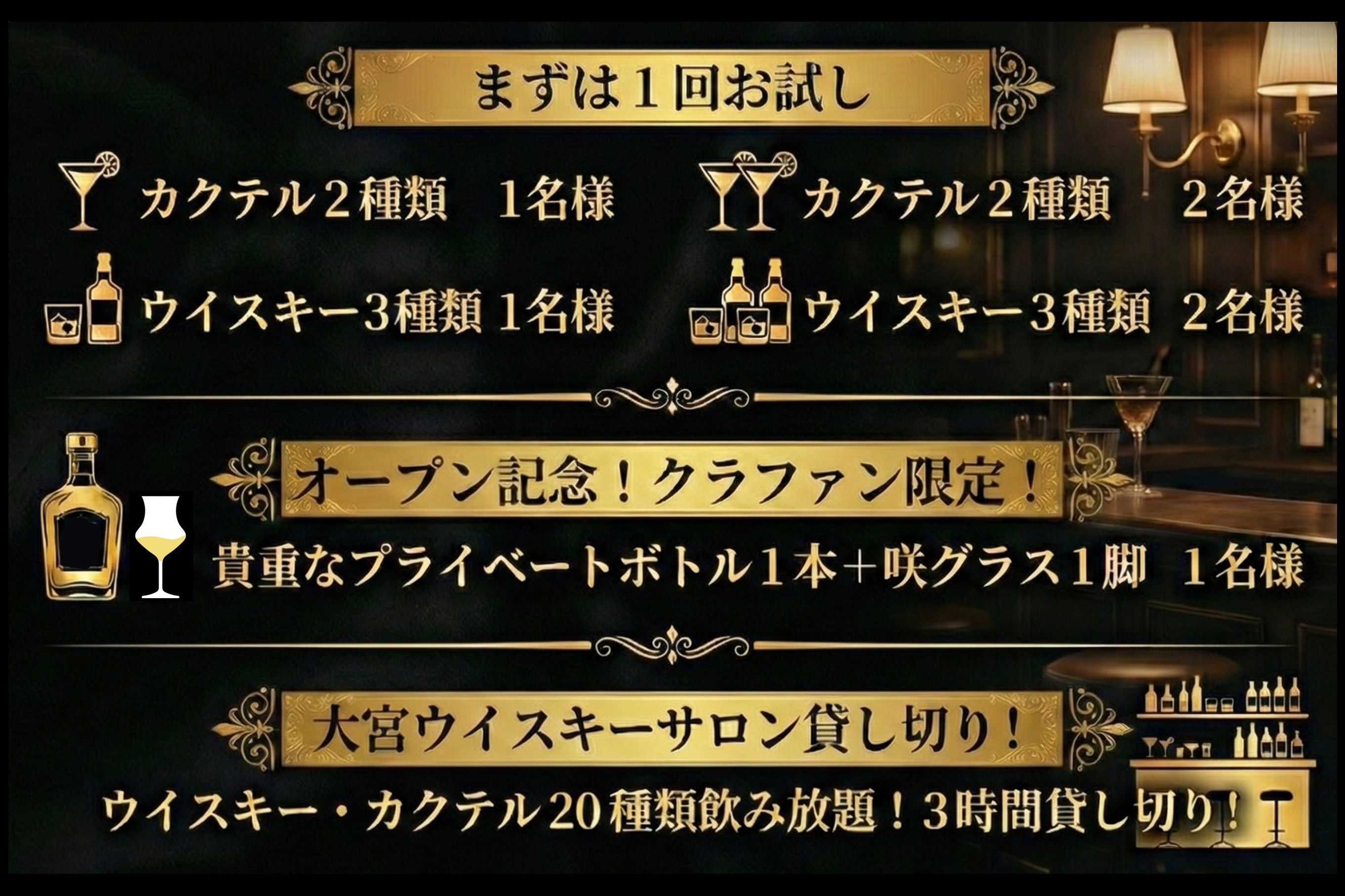 株式会社ロイヤルマイル(本社:東京都新宿区、代表取締役:静谷和典)は、2026年3月1日(日)に埼玉県さいたま市大宮区にグランドオープンするフランチャイズ2号店「BAR 大宮ウイスキーサロン」において、クラウドファンディング限定の目玉リターンとして【オープン記念!貸切り!】3時間完全貸切プラン」の提供開始をお知らせいたします。