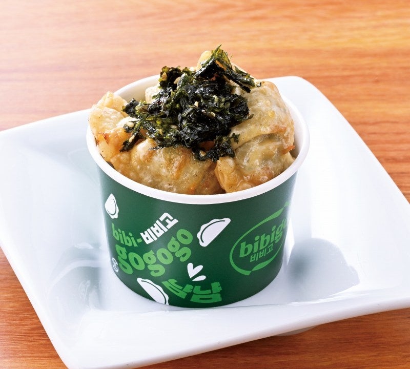 肉と野菜が詰まったbibigoの「水マンドゥ」を揚げ、韓国のりを散らしました。一口サイズで食べやすく、素材の旨みが凝縮されています。