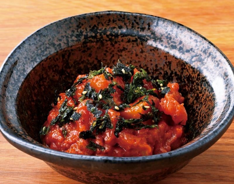 「岩手三陸やまだオランダ島サーモン(トラウトサーモン)」を、カクテキの食感とコチュジャンの辛みで引き立てた創作和韓メニューです。