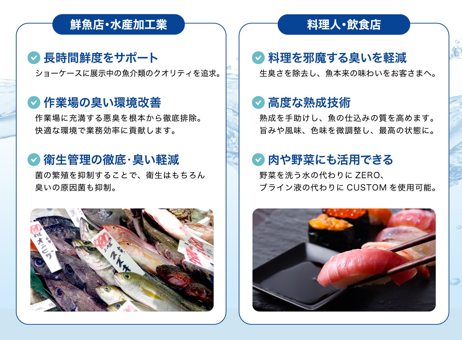 水産加工・下処理から高度な熟成技術まで、プロの要求に応える次世代の仕込み水です。