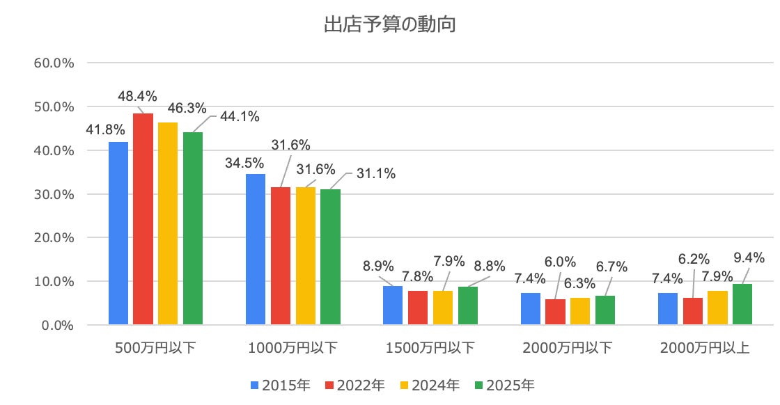 出店予算の分布を見ると、前回調査(2024年)と比較して「500万円以下」の割合は2.2ポイント減少し44.1%となりました。一方で、「1500万円以下」「2000万円以下」「2000万円以上」はいずれもわずかに増加しています。