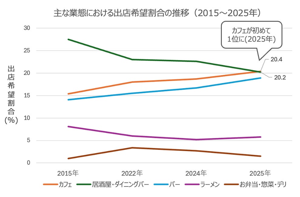 過去10年の推移を見ると、「カフェ」の出店希望割合は2015年の15.4%から2025年には20.4%まで上昇しており、緩やかな増加傾向が続いています。一方で、長年1位だった「居酒屋・ダイニングバー」は27.5%(2015年)から20.2%(2025年)まで減少しており、今回初めて「カフェ」が首位となりました。