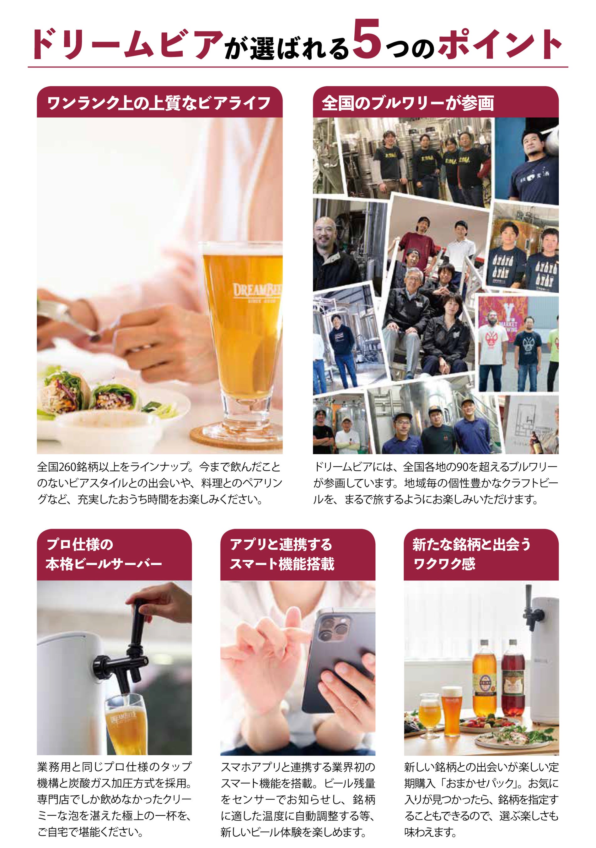 ドリームビアは、プロ仕様の家庭用本格ビールサーバーで、全国各地のクラフトビールを、まるで旅するように楽しめる会員制サービスです。作り手の想いと、ビールの持つ奥深い味わいや楽しみ方をお客様にお届けすることで、日本のビール文化をもっと豊かに、延いては日本の地域創生の一助となることを目指します。