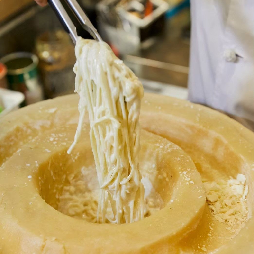 ホールチーズに熱々のパスタを絡めるパフォーマンスは必見。温泉たまごやベーコンなどでカスタマイズも。