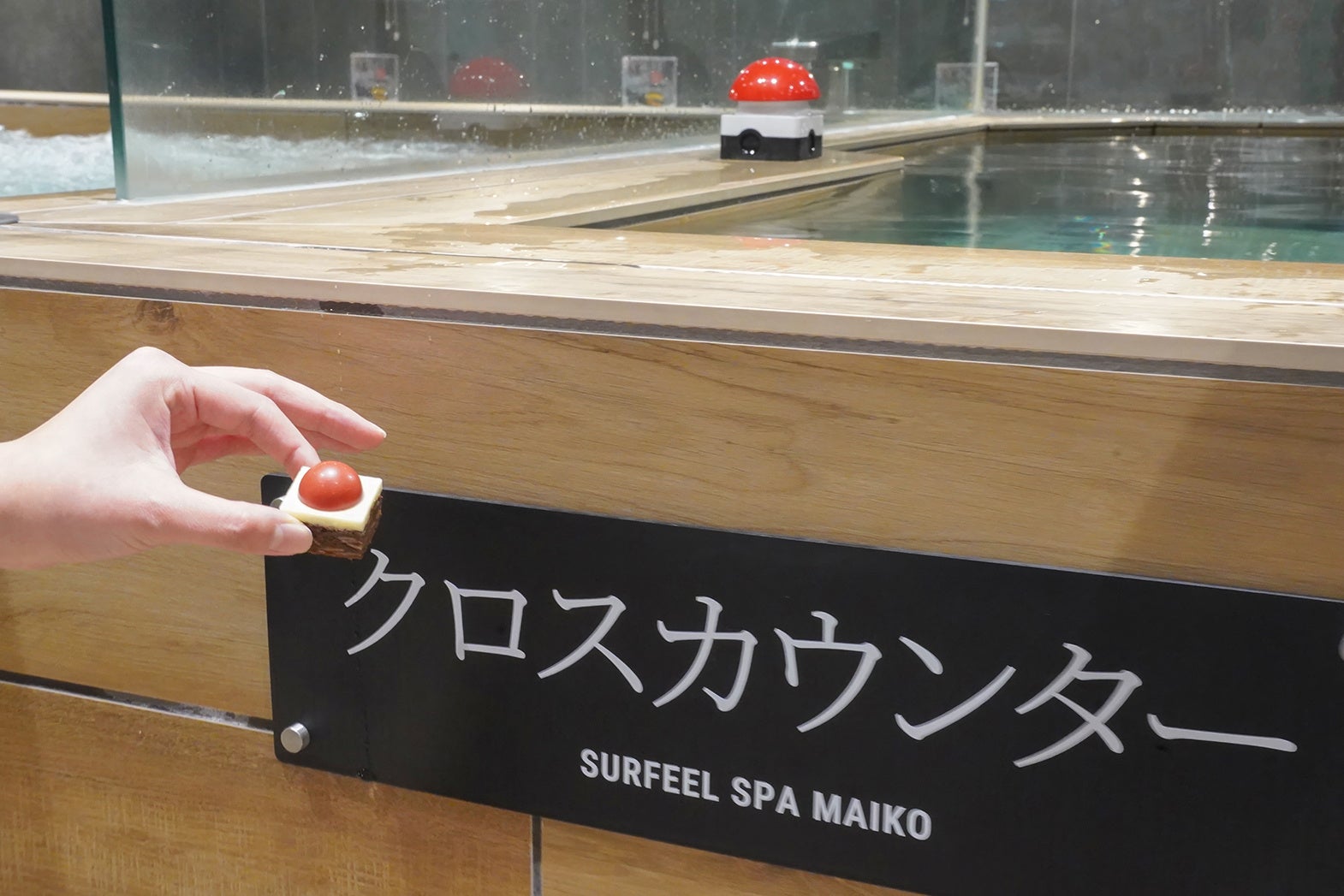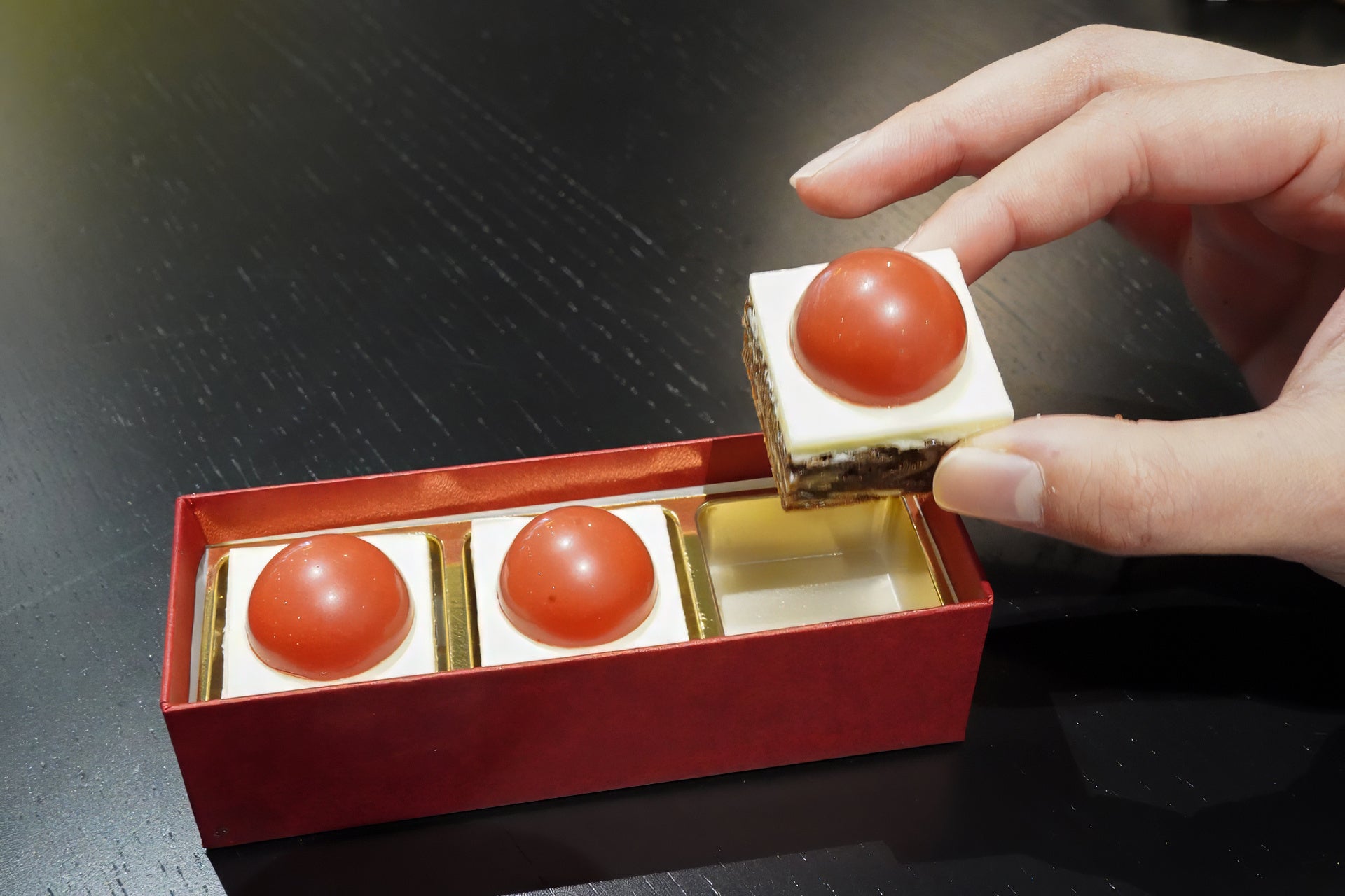 ホテル内メンズサウナの水風呂「クロスカウンター」は赤いボタンを押すと上から水が降り注ぐ特別仕様!そのボタンをイメージしたチョコレートです。
