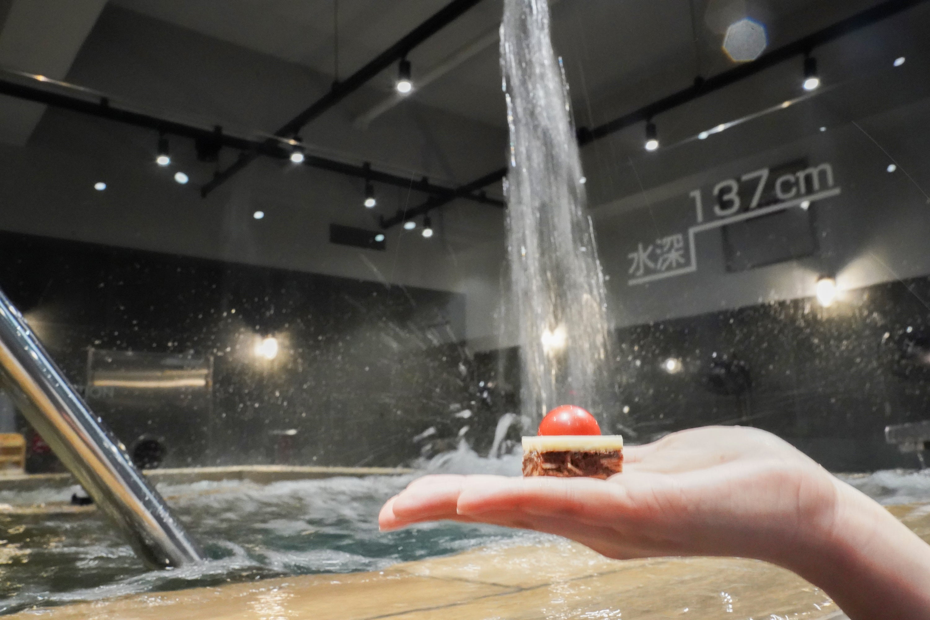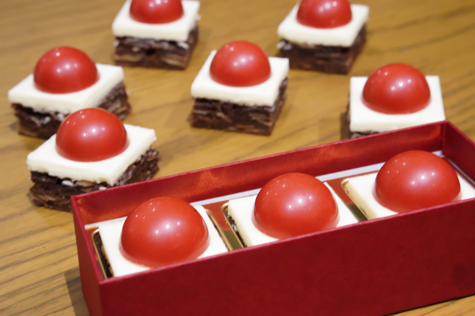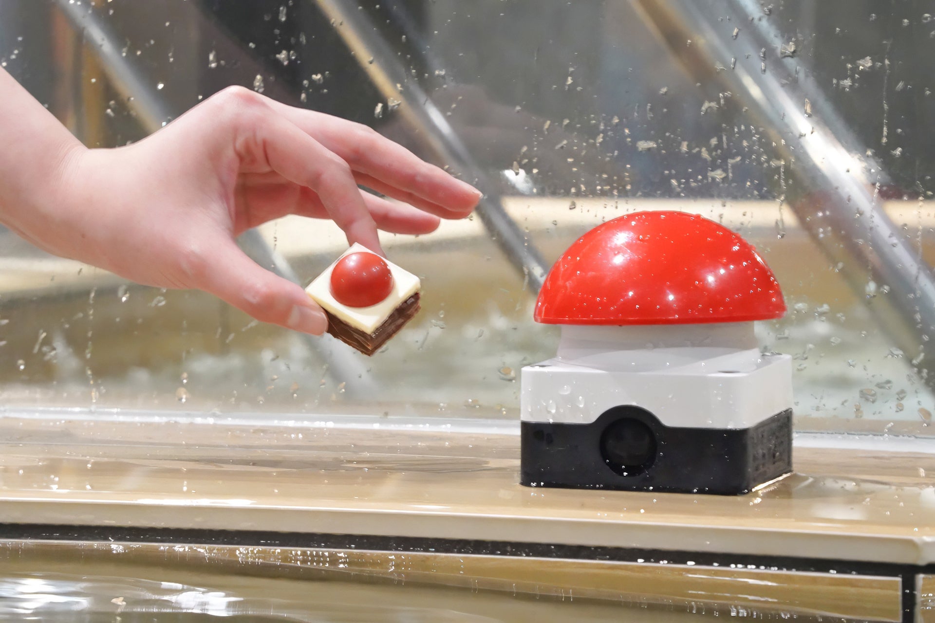ホテル内メンズサウナの水風呂「クロスカウンター」は赤いボタンを押すと上から水が降り注ぐ特別仕様!そのボタンをイメージしたチョコレートです。