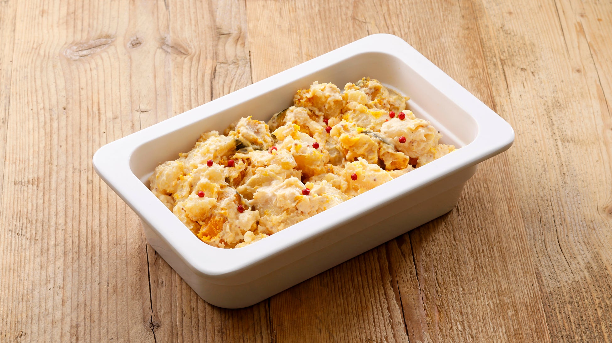 甘みとホクホク感が特徴の熟成じゃがいもと、恋するマロン(かぼちゃ)の美味しさをダイレクトに味わえるよう、素材の形を残し、食べ応えのある”ゴロゴロ食感”に仕上げたポテトサラダです。