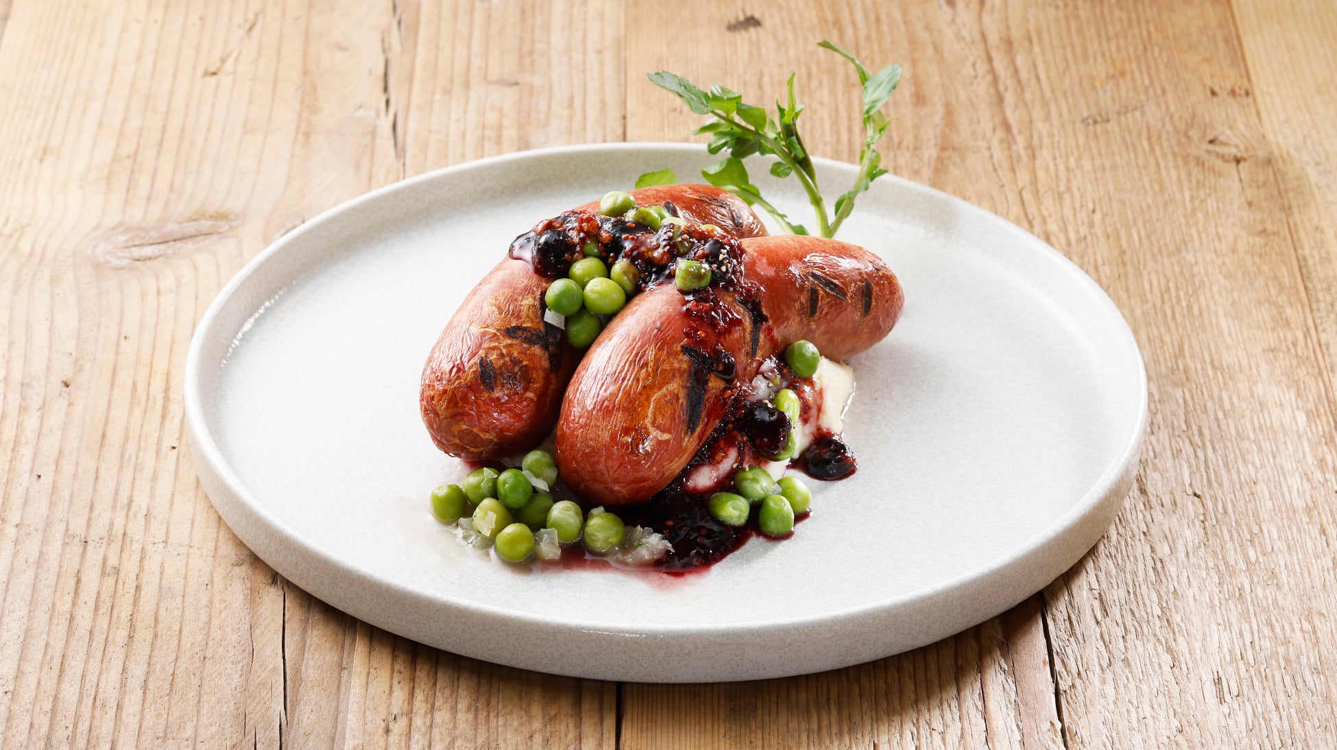 北海道産ビーフの旨みとパリッとした食感が特徴のソーセージにマッシュポテトと、バターで軽く煮込んだグリーンピースを添えました。ハスカップマスタードソースの甘みと爽やかさがよく合います。