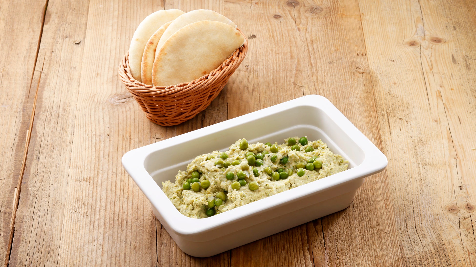 ひよこ豆をペースト状にした中東生まれのディップ「フムス」に、グリーンピースとミントを合わせた春らしい色合いと爽やかな香りが楽しめる一品。ピタパンにたっぷりつけてお召し上がりください。