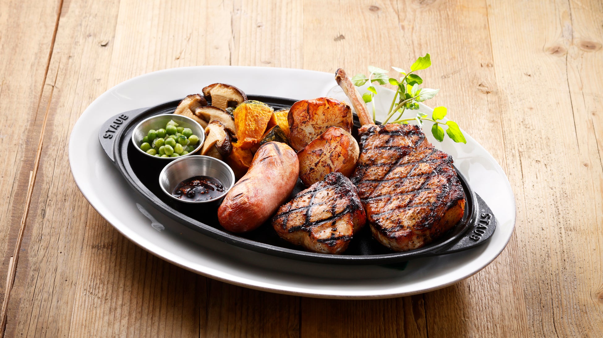 北海道生まれのブランド豚「ゆめの大地」のジューシーで旨みあふれる骨付きポークステーキと噛むほどに味わい深いロースに、北海道産ビーフソーセージを豪快に盛り合わせました。お肉はハスカップマスタードソースで味の変化をお楽しみください。
