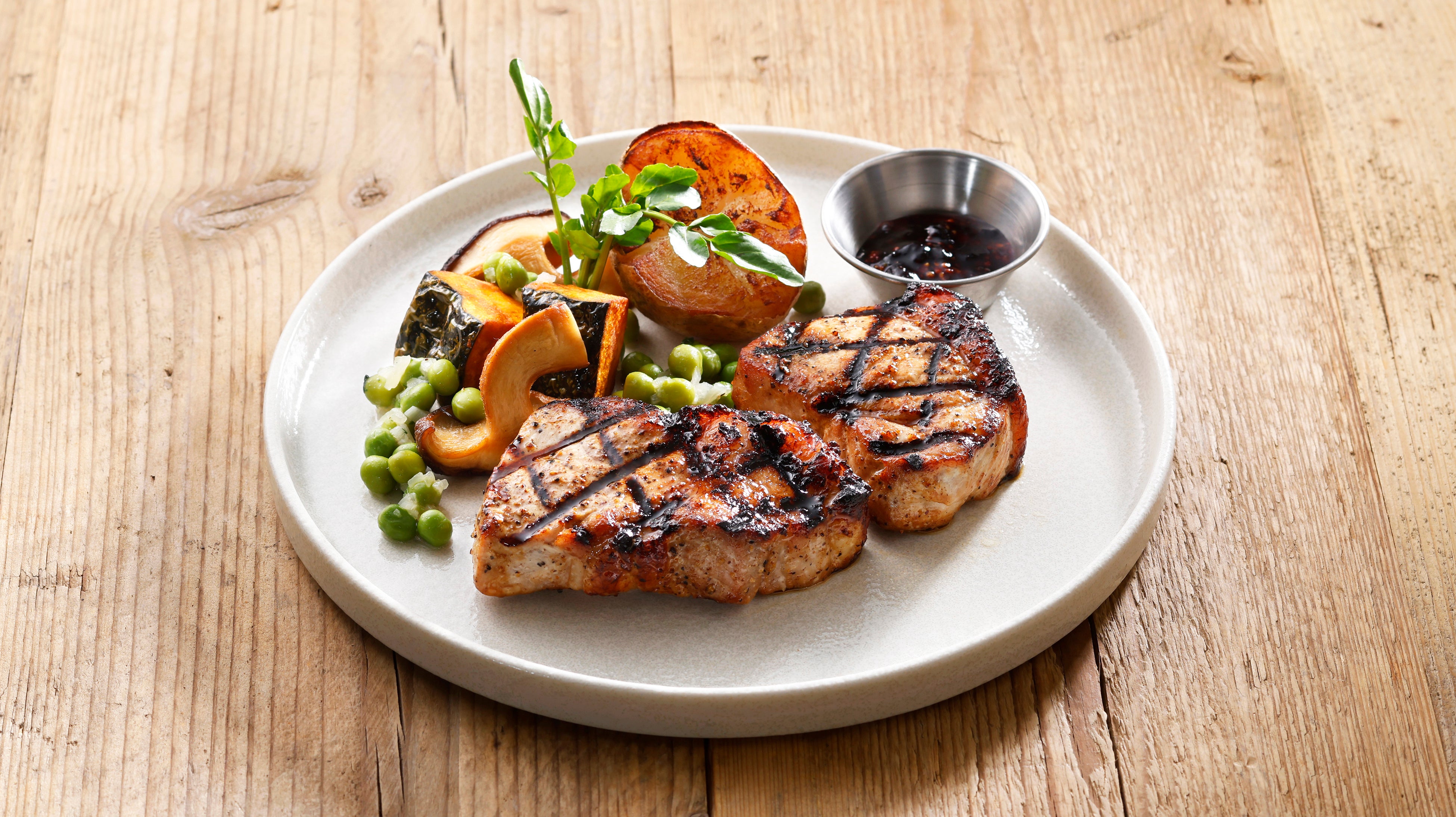 北海道生まれのブランド豚「ゆめの大地」のロースを店内でスパイスとはちみつとマリネしてからグリルで焼き上げ、北海道産の熟成じゃがいも、恋するマロン(かぼちゃ)、原木しいたけ、グリーンピースを添えた、気軽に北海道の恵みを堪能できる一皿です。