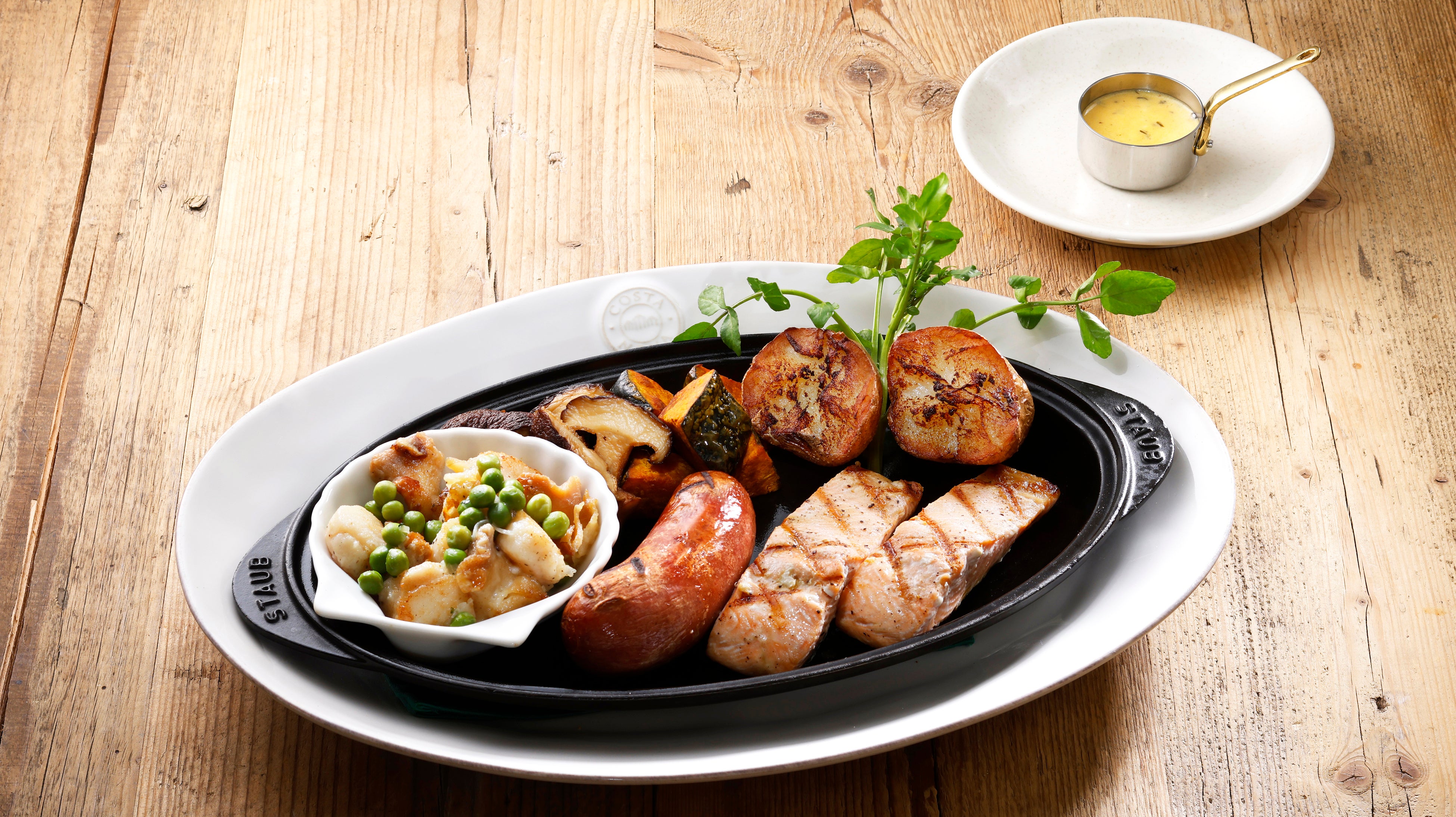 春から夏にかけて獲れる白鮭「時鮭(ときしらず)」。その脂がのりふっくらとしたグリルを中心に、パリッとジューシーなビーフソーセージや、帆立とコリっとした食感が特徴のつぶ貝のソテーにグリーンピースが彩りを添えるにぎやかな盛り合わせです。