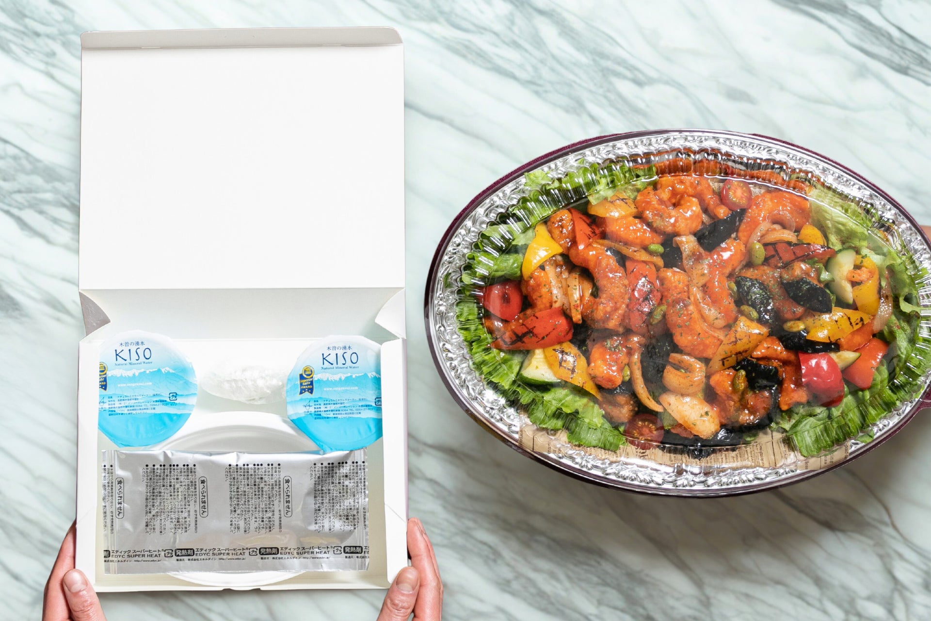 温製料理はどこでもほかほかに:前述の通り、温製のメニューは加熱式容器にてお届けしております。オフィスや会議室・屋外など、どこでも簡単にできたての美味しさをお楽しみいただけます。