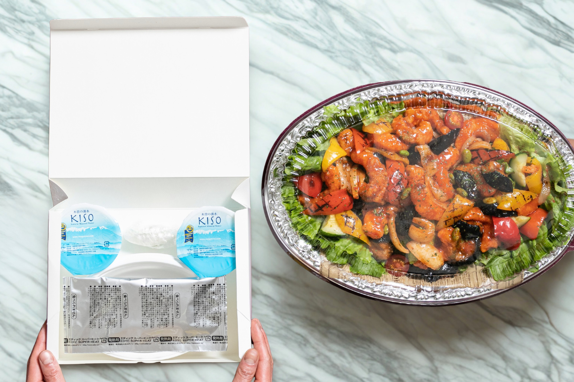 温製料理はどこでもほかほかに:前述の通り、温製のメニューは加熱式容器にてお届けしております。オフィスや会議室・屋外など、どこでも簡単にできたての美味しさをお楽しみいただけます。
