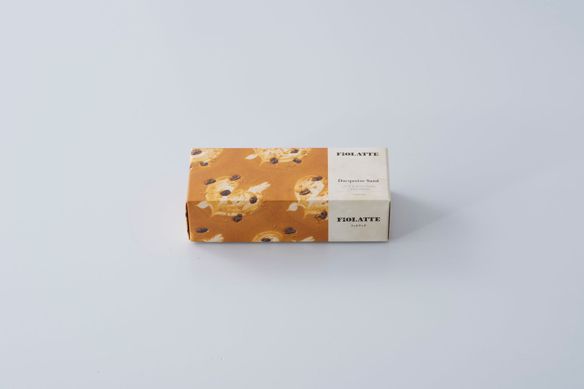 ラムレーズンを練り込んだカフェラテ風味の発酵バタークリームを、ほんのりとシナモンが香るサクサクなダックワーズ生地でサンドしました。華やかなカフェラテの薫りのなかに、ラムレーズンとシナモンのアクセントが楽しめる、とても濃厚で贅沢なお味の逸品です。