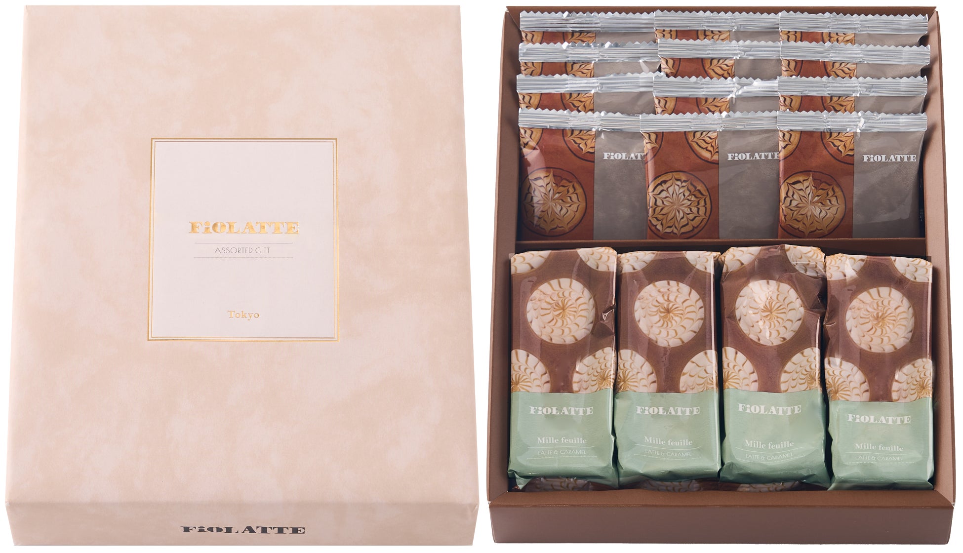 看板商品の「サンドクッキー」と、定番の「ミルフィユ」を詰め合わせた、ラテスイーツの心華やぐアソートギフト。それぞれの異なる味わいと食感をおたのしみください。