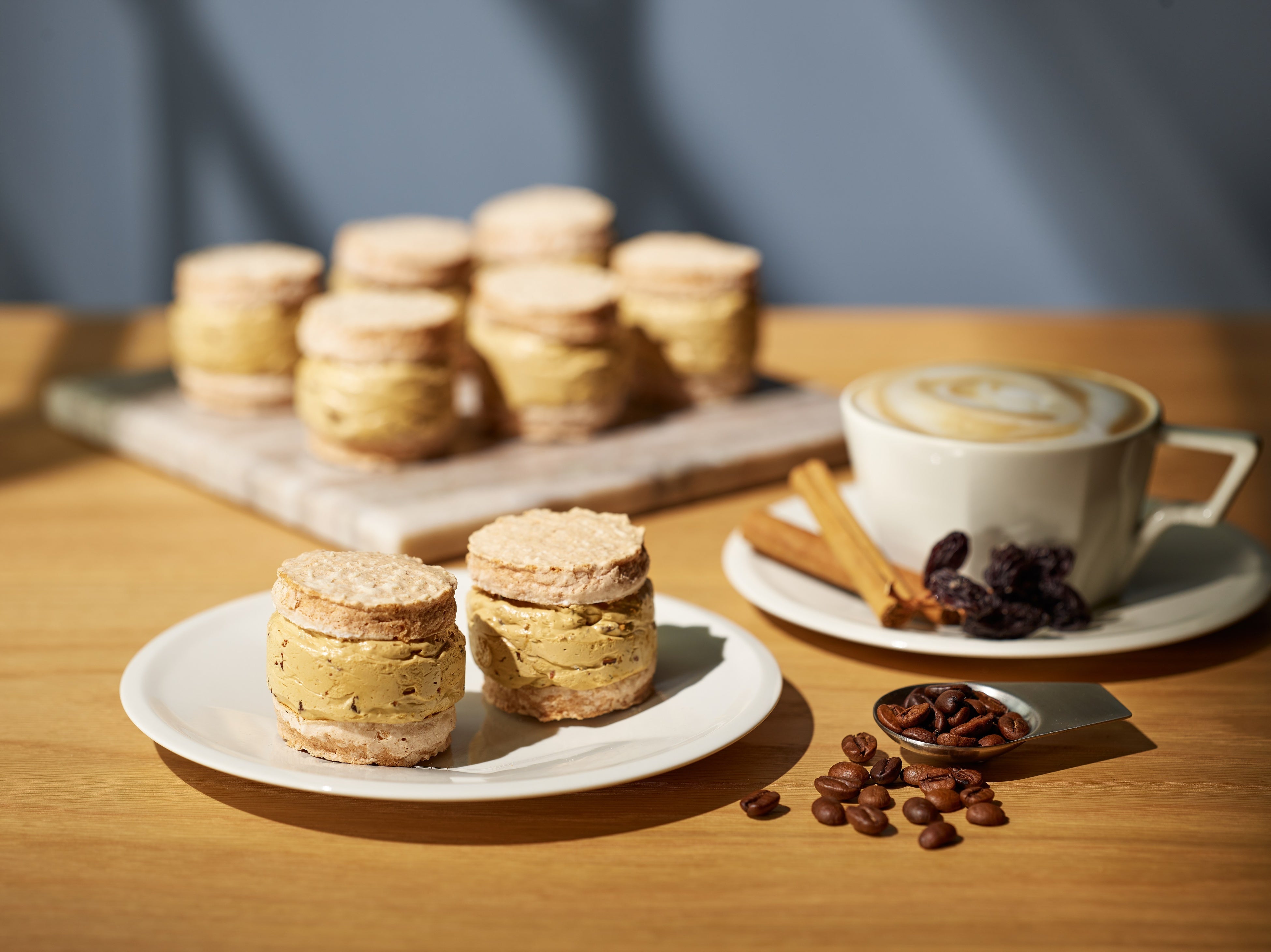 ラムレーズンを練り込んだカフェラテ風味の発酵バタークリームを、ほんのりとシナモンが香るサクサクなダックワーズ生地でサンドしました。華やかなカフェラテの薫りのなかに、ラムレーズンとシナモンのアクセントが楽しめる、とても濃厚で贅沢なお味の逸品です。