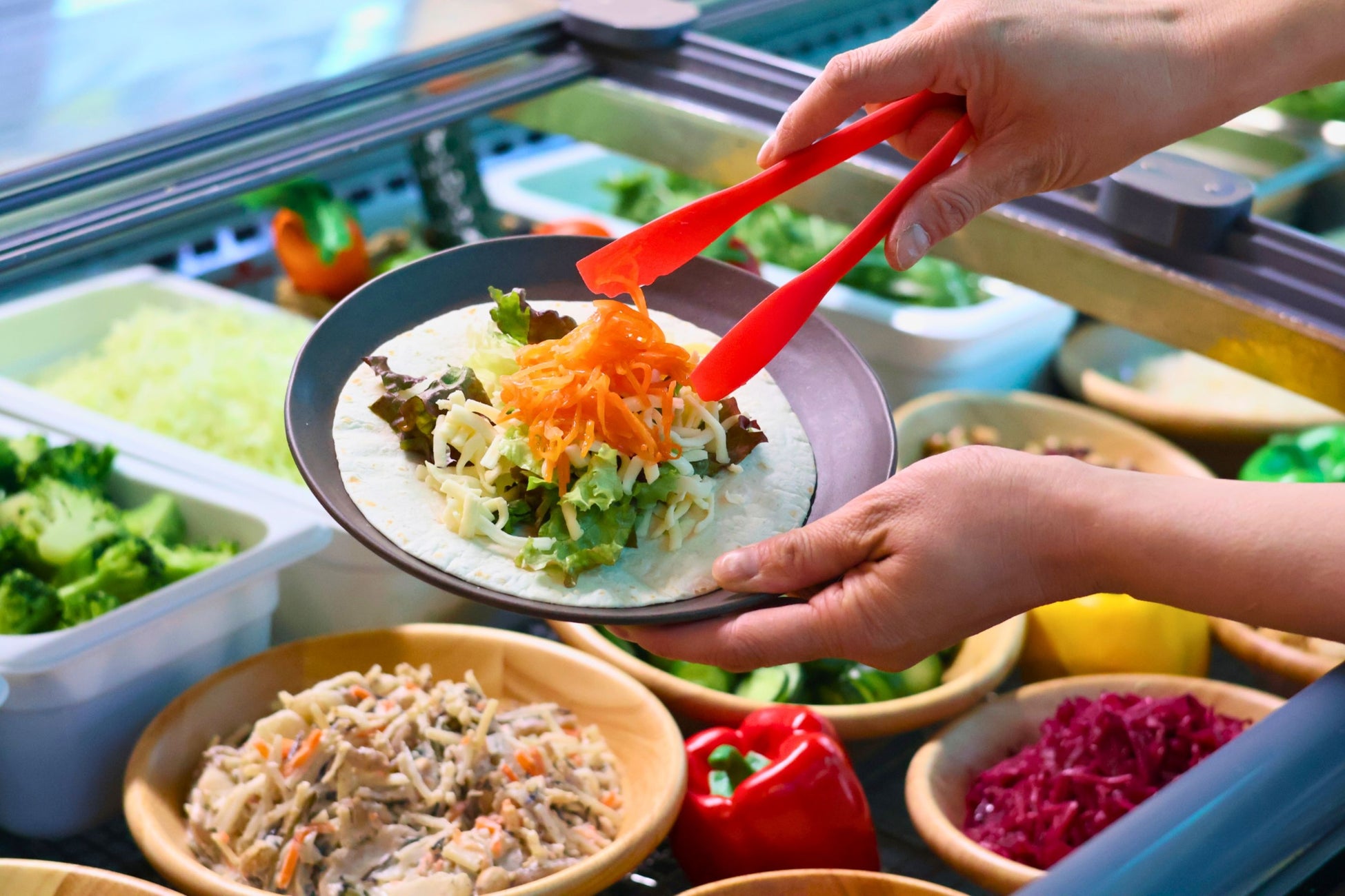 今回の注目コンテンツが、自由に作れるサラダ&タコスコーナーです。