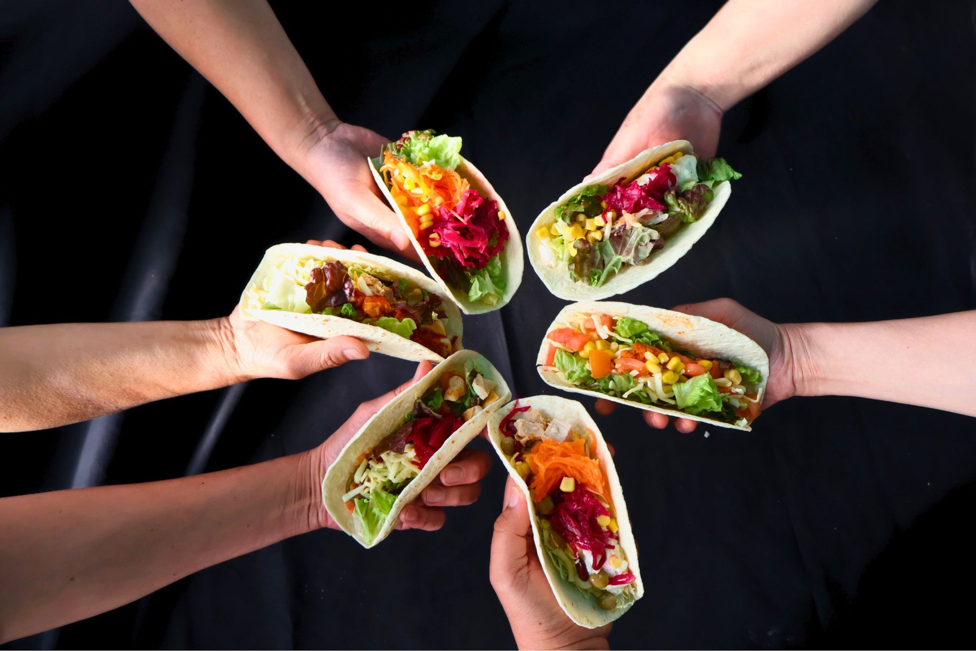 肉、野菜、ソースなどを自由に組み合わせ、自分だけの「MYタコス」を作ることができます。
