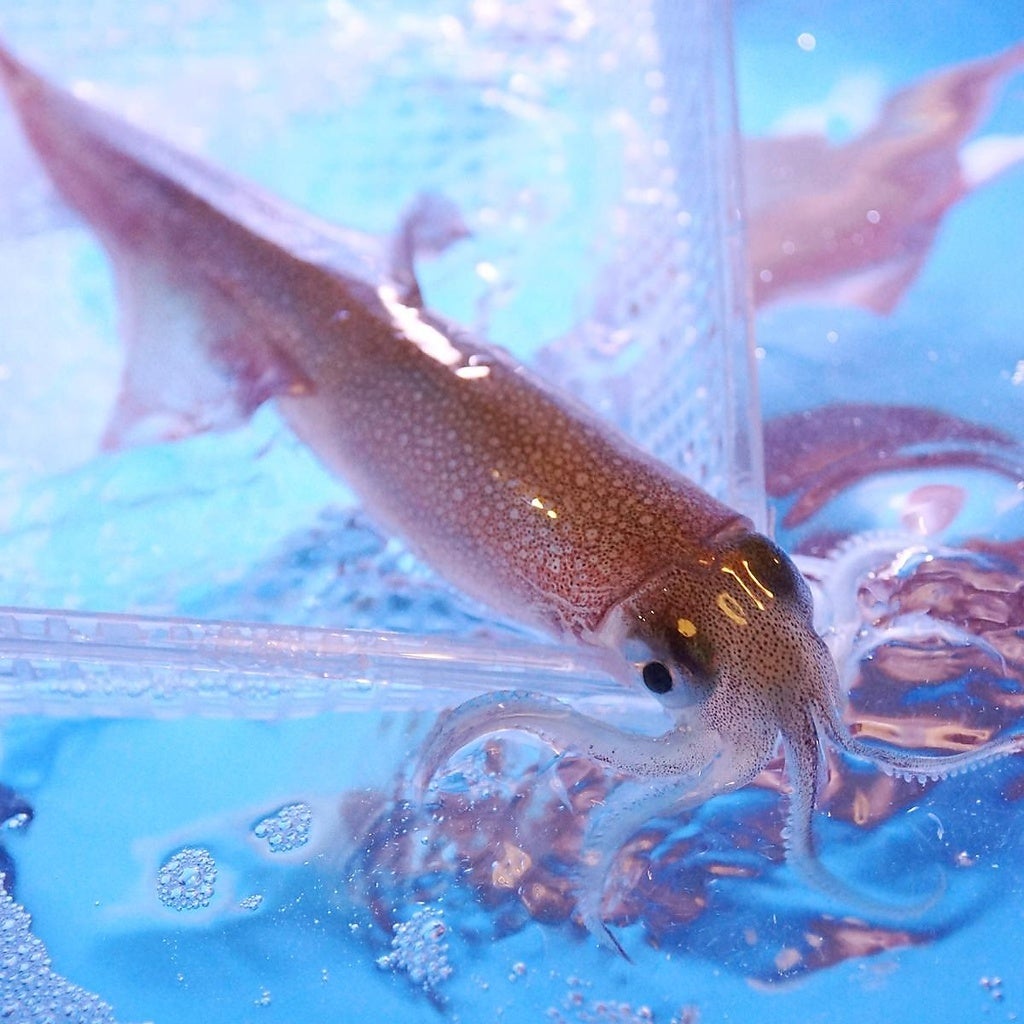 通常イカは、ストレスを感じたり、〆ると5分ほどで白くなっていきます。そこで、当店では、イカにストレスを与えない特注のイカストックで陸送し、店内に泳ぎイカ専用の生け簀で管理。更に、注文をうけてから泳いでいるイカを調理する為、これ以上新鮮なイカはありません。透き通るような透明なイカをお楽しみいただけます。吸盤は口に吸い付いてくる程です。