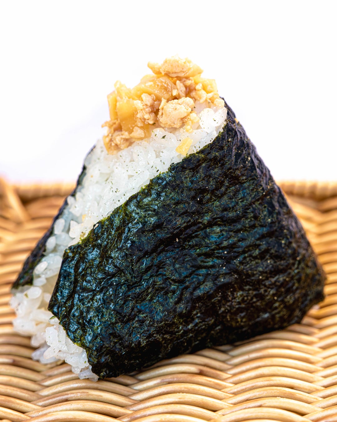 そんな飯倉シェフが今回調理したおむすびの具材は、「和鶏そぼろと筍の甘辛煮」。春の味の代表格であるタケノコをふんだんに使用した贅沢なおむすびです。普通であれば鶏そぼろが主役になりそうなものですが、今回の主役はあくまで筍!