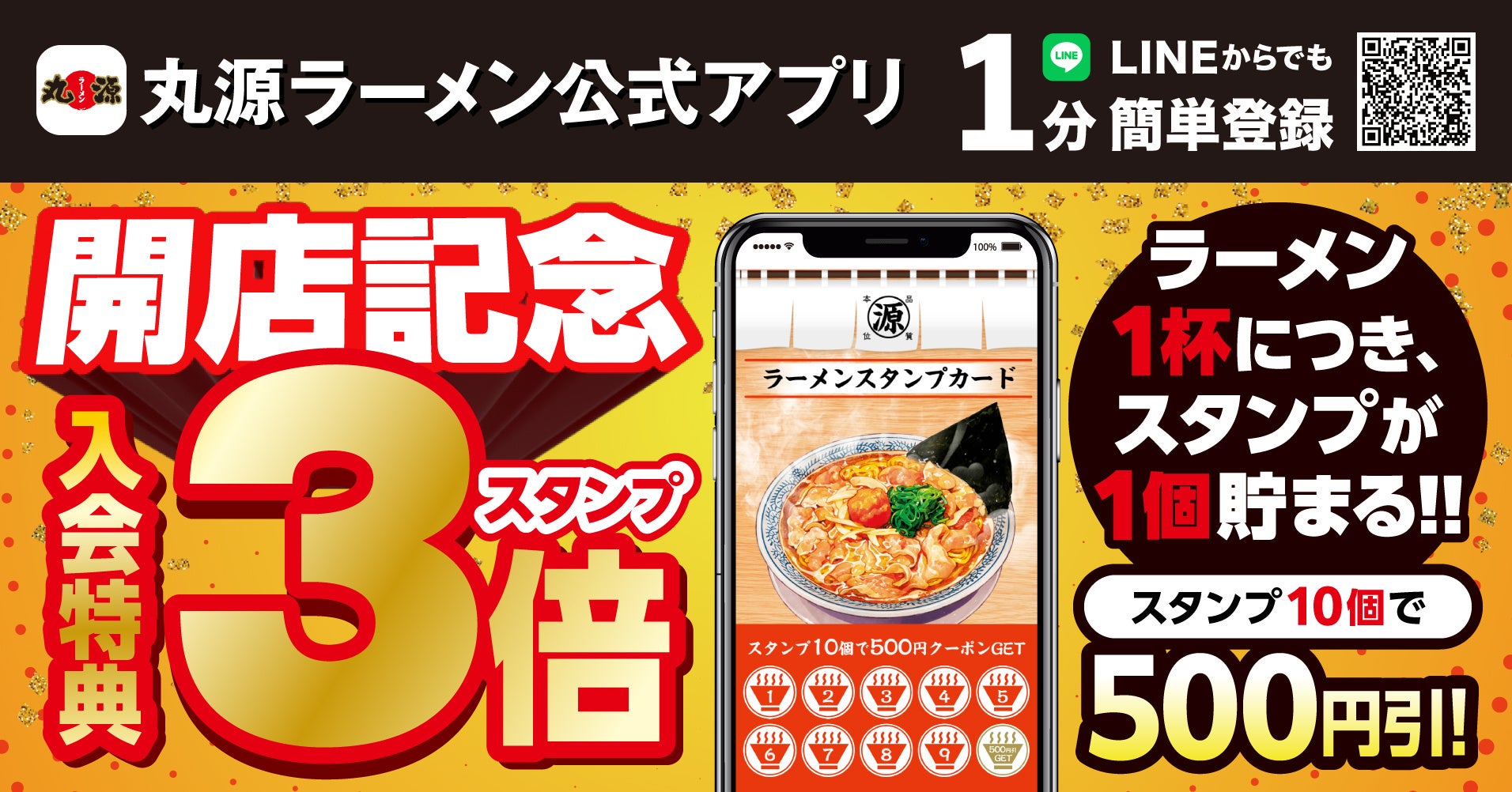 開店記念として、2026年4月30日(木)まで、アプリ新規入会特典「スタンプ3倍キャンペーン」を開催いたします。期間内に『丸源ラーメン 富田林店』でお食事された方が対象です。通常ラーメン1杯につきスタンプ1個たまるところ、キャンペーン期間中はラーメン1杯につきスタンプ3個たまります。この期間をお見逃しなく!