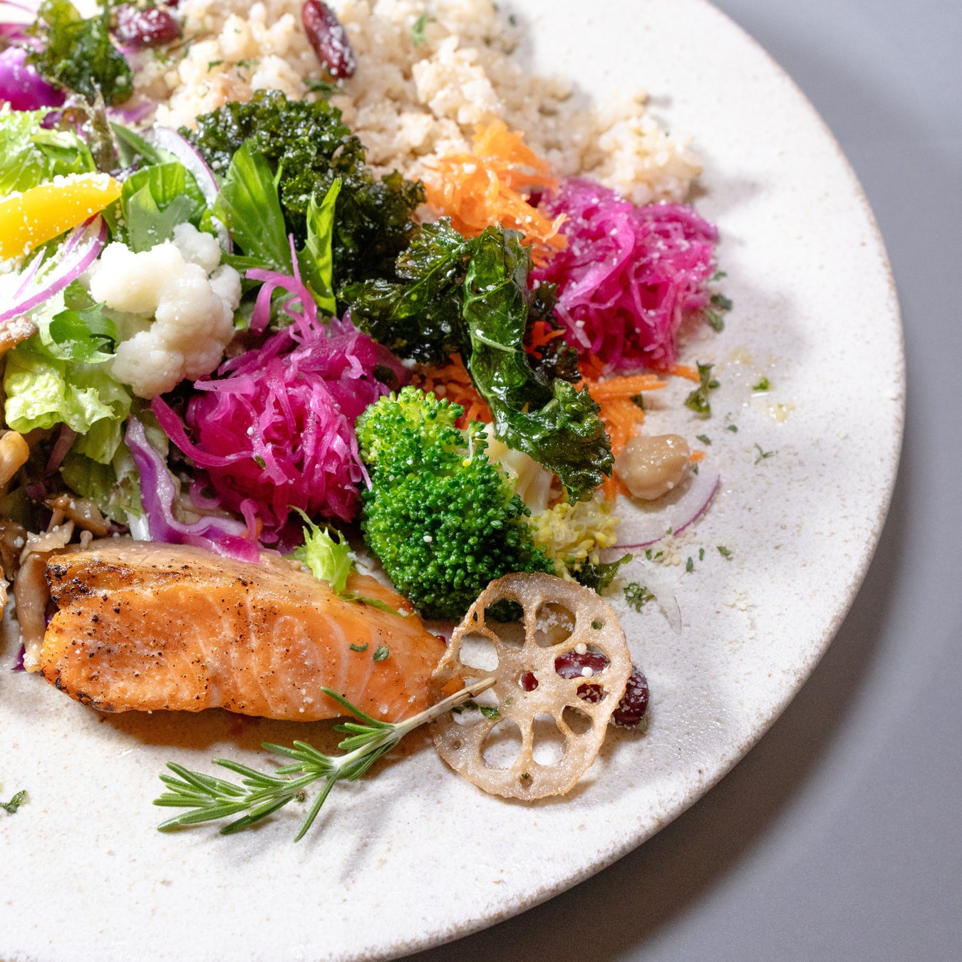 愛媛県で手作り栄養バランス弁当を販売する「オイシイオト」とのコラボレーションカフェとしてリニューアルオープンしたFLUX CAFE。同ビルで展開する統合型トレーニングソリューション「FLUX CONDITIONINGS」のコンセプトと連動し、不足しがちな野菜をたっぷり取り入れた「一汁三菜」を中心とする定食メニューを多数ラインナップ。