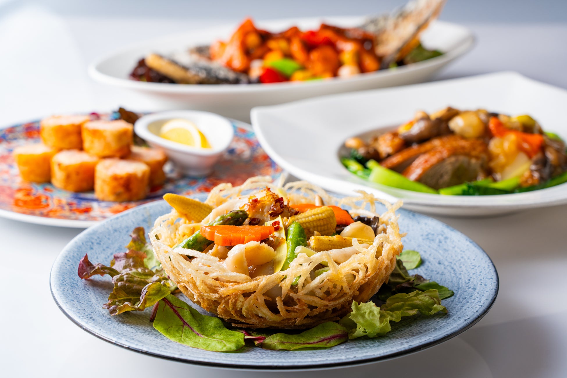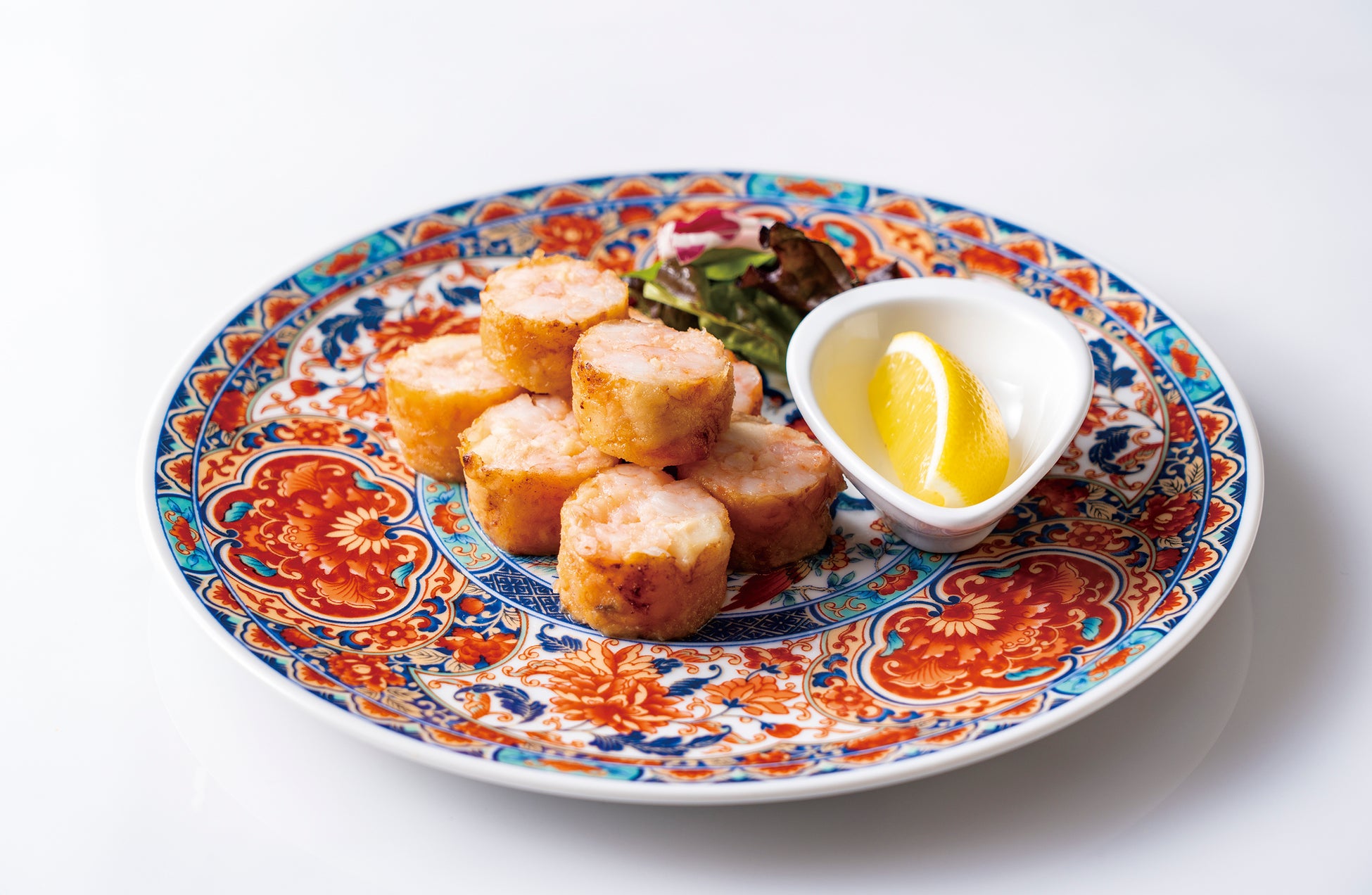 しいたけやイタヤ貝、くわいなど、さまざまな食感を加えた海老の餡を、薄く繊細な網油でやさしく包んで軽やかに揚げた逸品。広東料理伝統の技法で香ばしく仕上げられた一皿をご堪能ください。