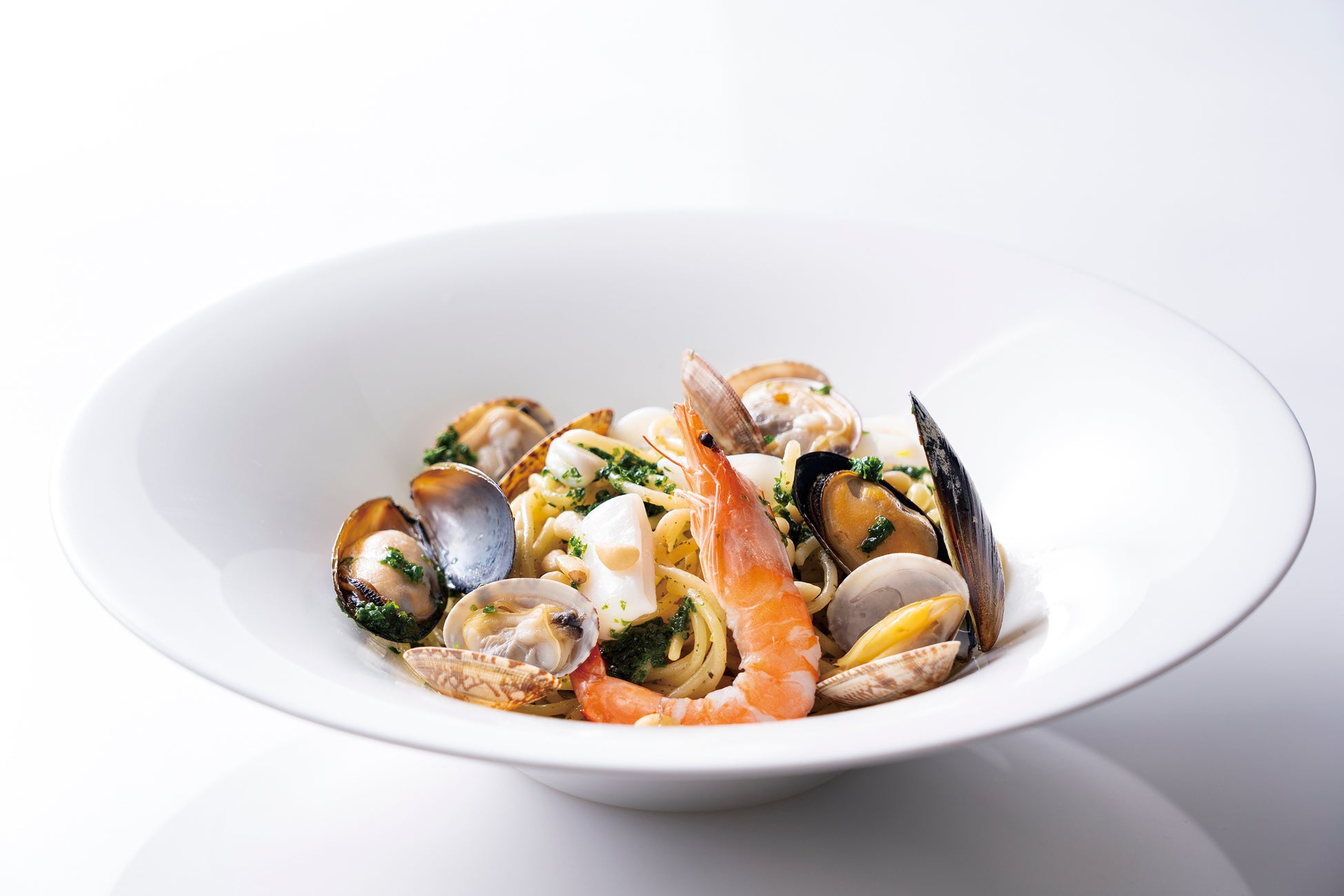 海老やムール貝、イカなどの海鮮をふんだんに使用し、松の実を加えたホテル特製ジェノベーゼソースで風味豊かに仕上げました。当時のレシピをもとに再現した彩り鮮やかなパスタです。