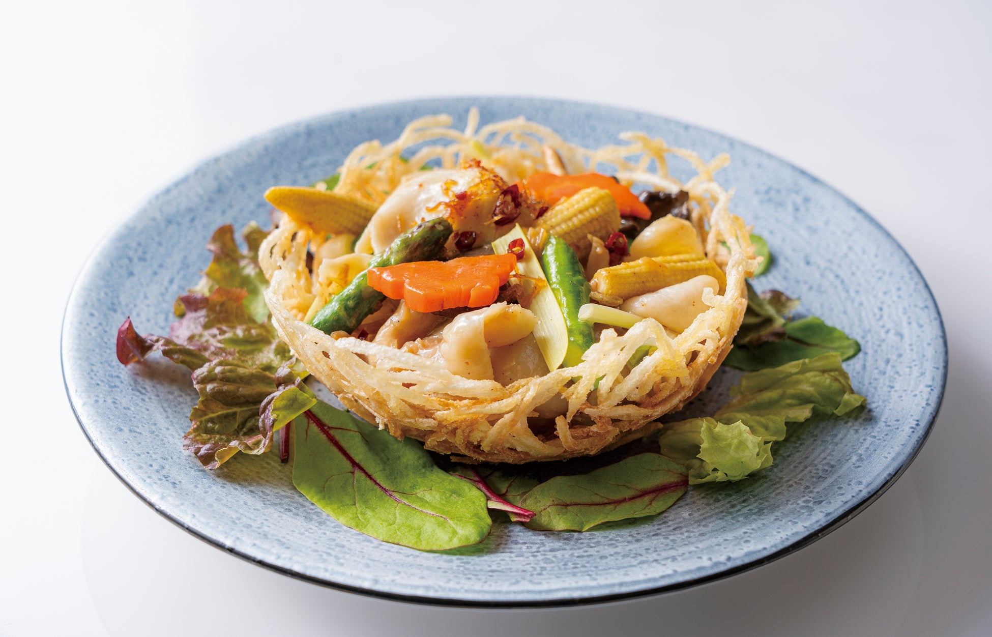 じゃがいもを揚げて巣に見立てた器に、自家製XO醤で炒めた鮑を贅沢に盛り付けました。1990年代に祝宴料理として親しまれた華やかな逸品を、特別な席を彩った当時の味わいそのままに復刻いたしました。