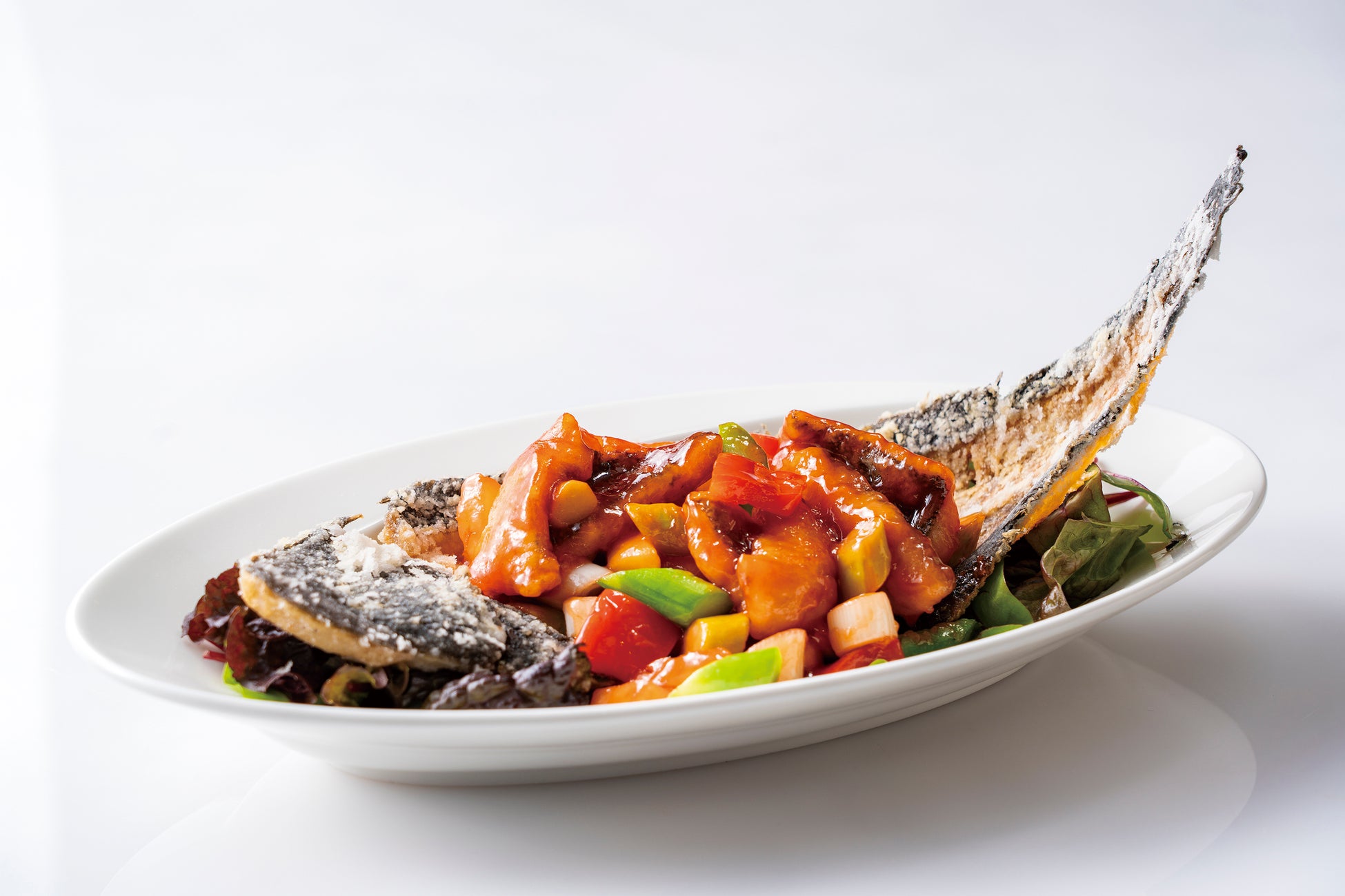 香ばしくふっくらと揚げたシタビラメを、開業当時から守り続けられている伝統の甘酢ソースで絡めました。サンザシやザラメで爽やかかつコク深い味わいの甘酢ソースがシタビラメの旨みを引き立てます。