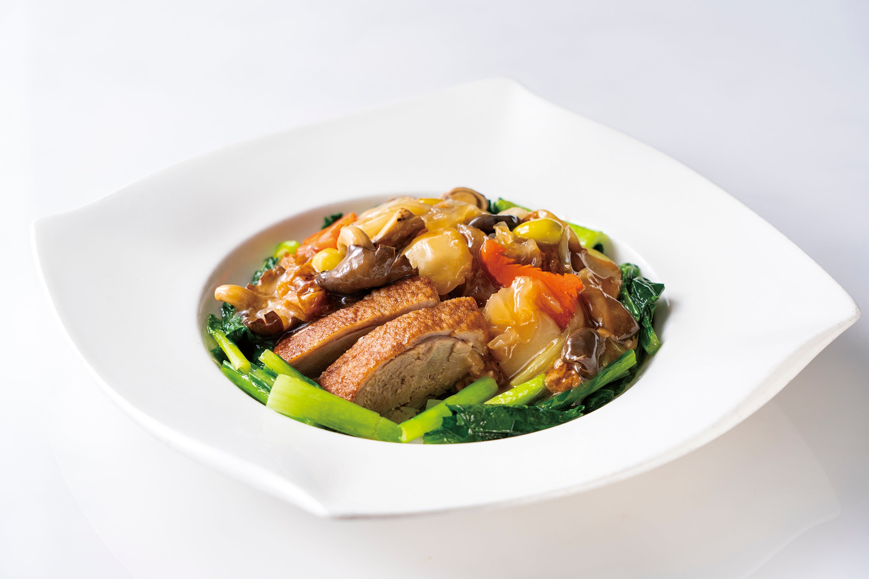 旨みたっぷりの合鴨をじっくりと煮込み、彩り豊かな五目野菜とともに仕上げました。素材それぞれの持ち味が溶け合う滋味深く奥行きのある味わいは、広東料理ならではの技が際立つ一皿です。