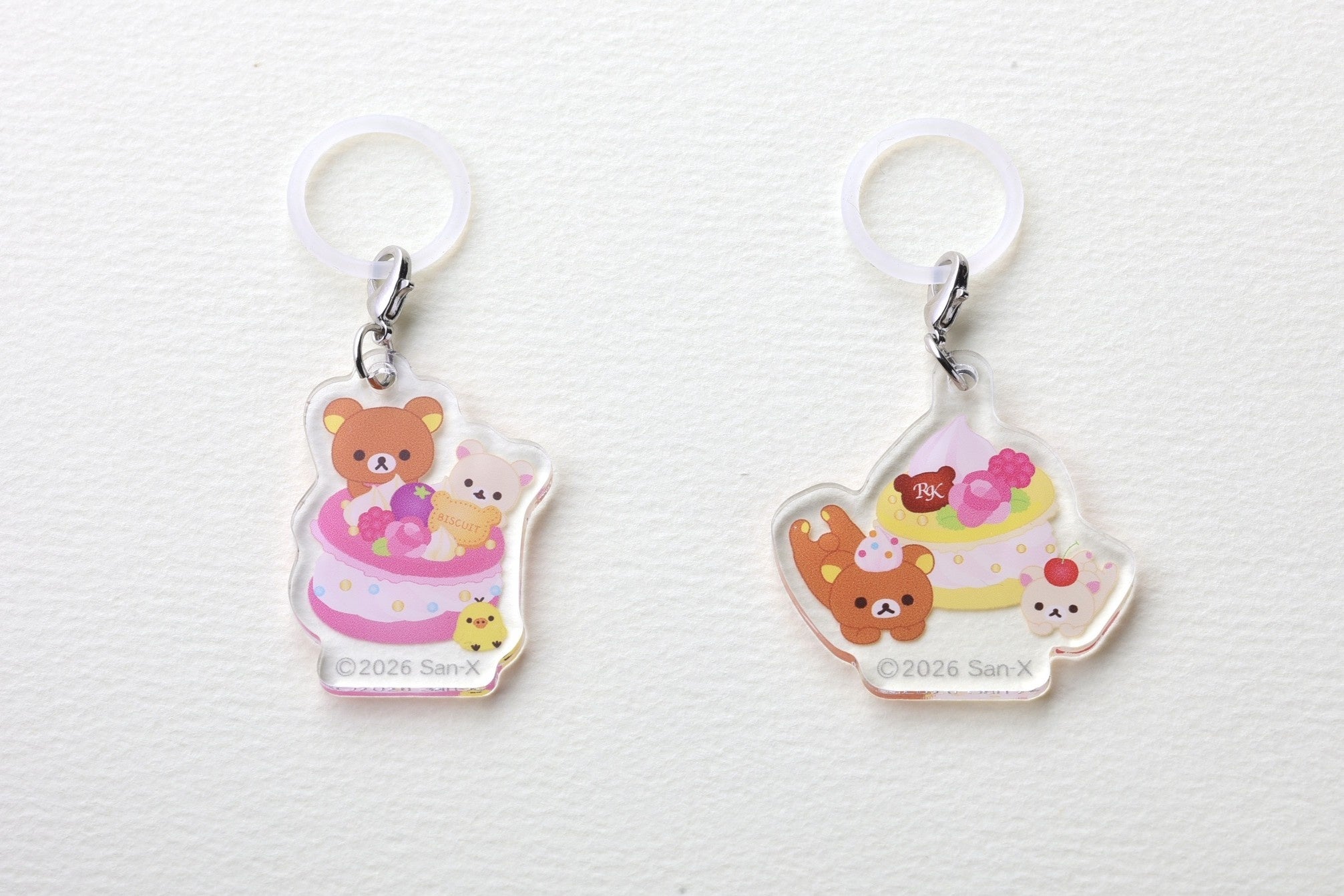『「ホテルニューオータニ」×「リラックマ」スーパースイーツビュッフェ~ひだまりのメロン・マンゴー&ハニー~』にご来場のお客さま(4歳以上)には、オリジナルノベルティとして、1名さまにつき1個「アクリルマーカーチャーム」をプレゼント!デザインは2種類ご⽤意しています(デザインは選べません)。期間限定スイーツビュッフェの思い出に、ペットボトルや傘の目印として、いつでも持ち歩きたい可愛いデザインです。