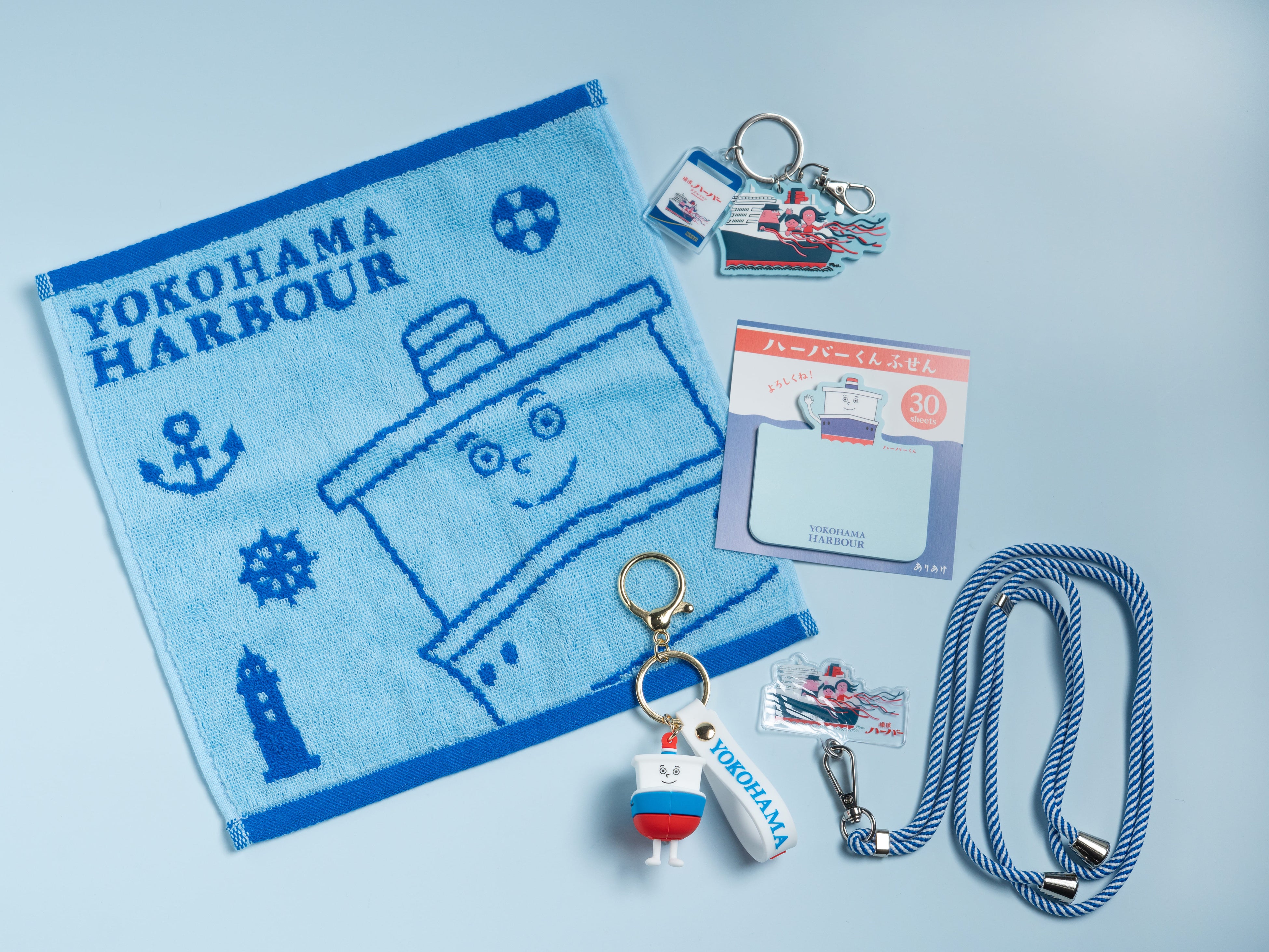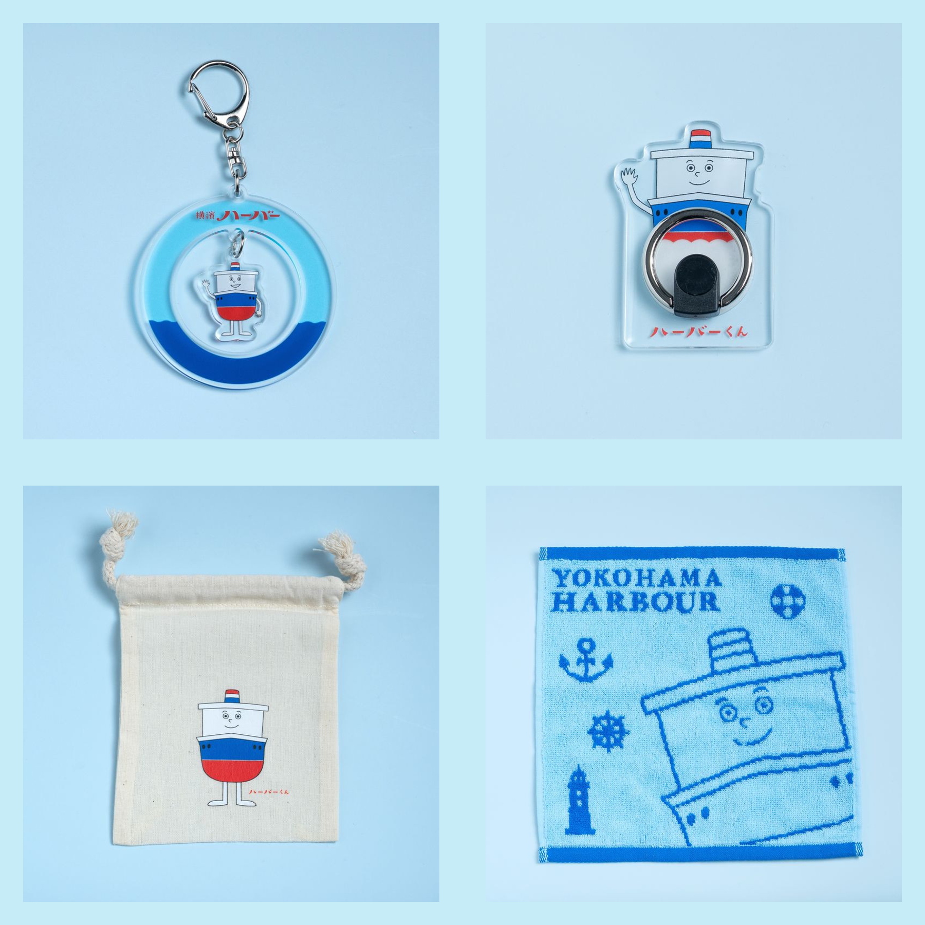 ラインナップ:ハーバーくんジャガードタオル青、ハーバーくん巾着、ハーバーくんモバイルリング、ハーバーくんゆらゆらアクキー