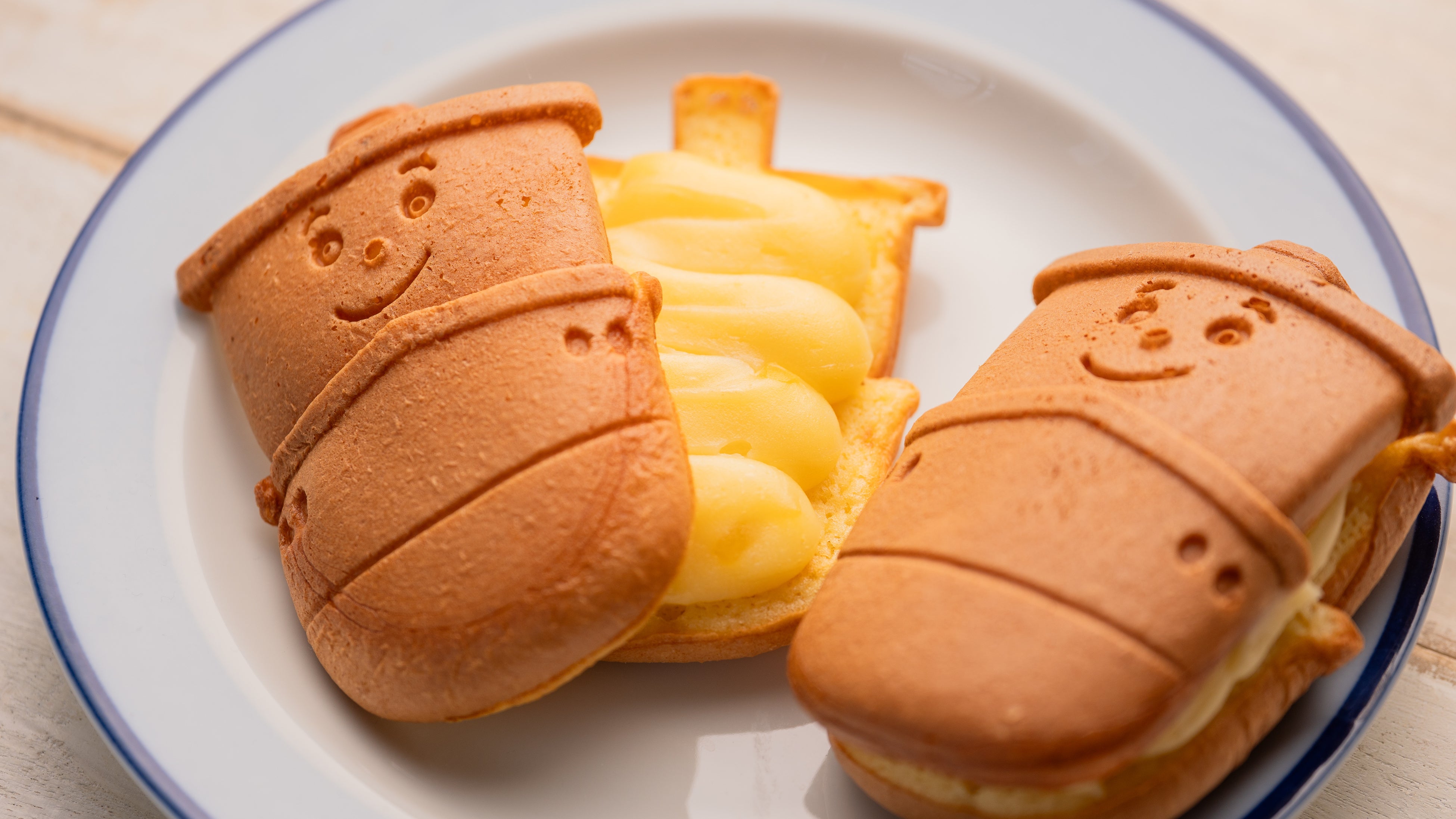 本商品は、ふわふわのハーバーくん型ワッフル生地に特製ダブルマロンクリームをサンドしたスイーツです。横濱ハーバーダブルマロン餡とカスタードクリームをブレンドした特製ダブルマロンクリームを、ふわふわのハーバーくんワッフル生地で焼き上げ、できたての瞬間にサンドしました。店頭で生地を一枚ずつ焼き上げることで、焼きたてならではの香りや食感をそのままお楽しみいただけます。冷やしてもしっとりとしたおいしさが楽しめる一品です。