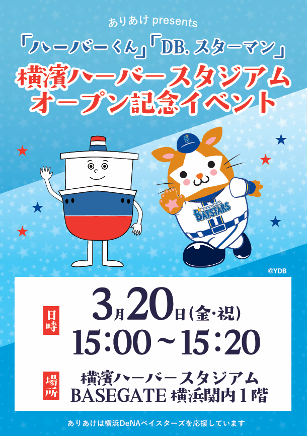 BASEGATE横浜関内のグランドオープンを記念し、ありあけ公式マスコットキャラクター「ハーバーくん」と、横浜DeNAベイスターズ公式マスコットキャラクター「DB.スターマン」が遊びにやってきます。