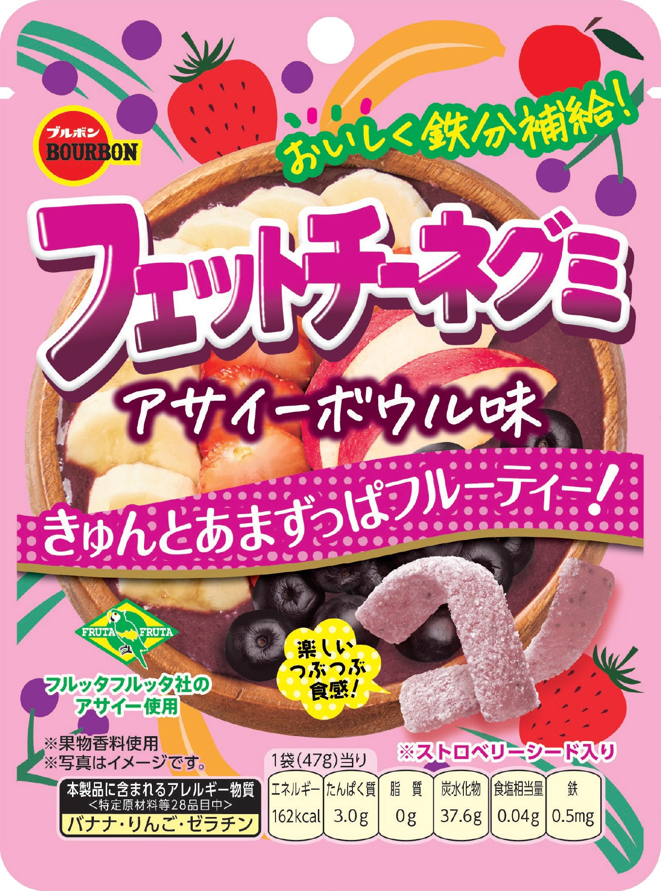 この度、株式会社フルッタフルッタ(所在地:東京都千代田区 社長:長澤 誠、以下当社)のアサイーエキスを使用した、「フェットチーネグミアサイーボウル味」が株式会社ブルボン(本社:新潟県柏崎市 代表取締役社長:吉田匡慶)より2026年3月17日(火)から全国で販売されますことをお知らせいたします。
