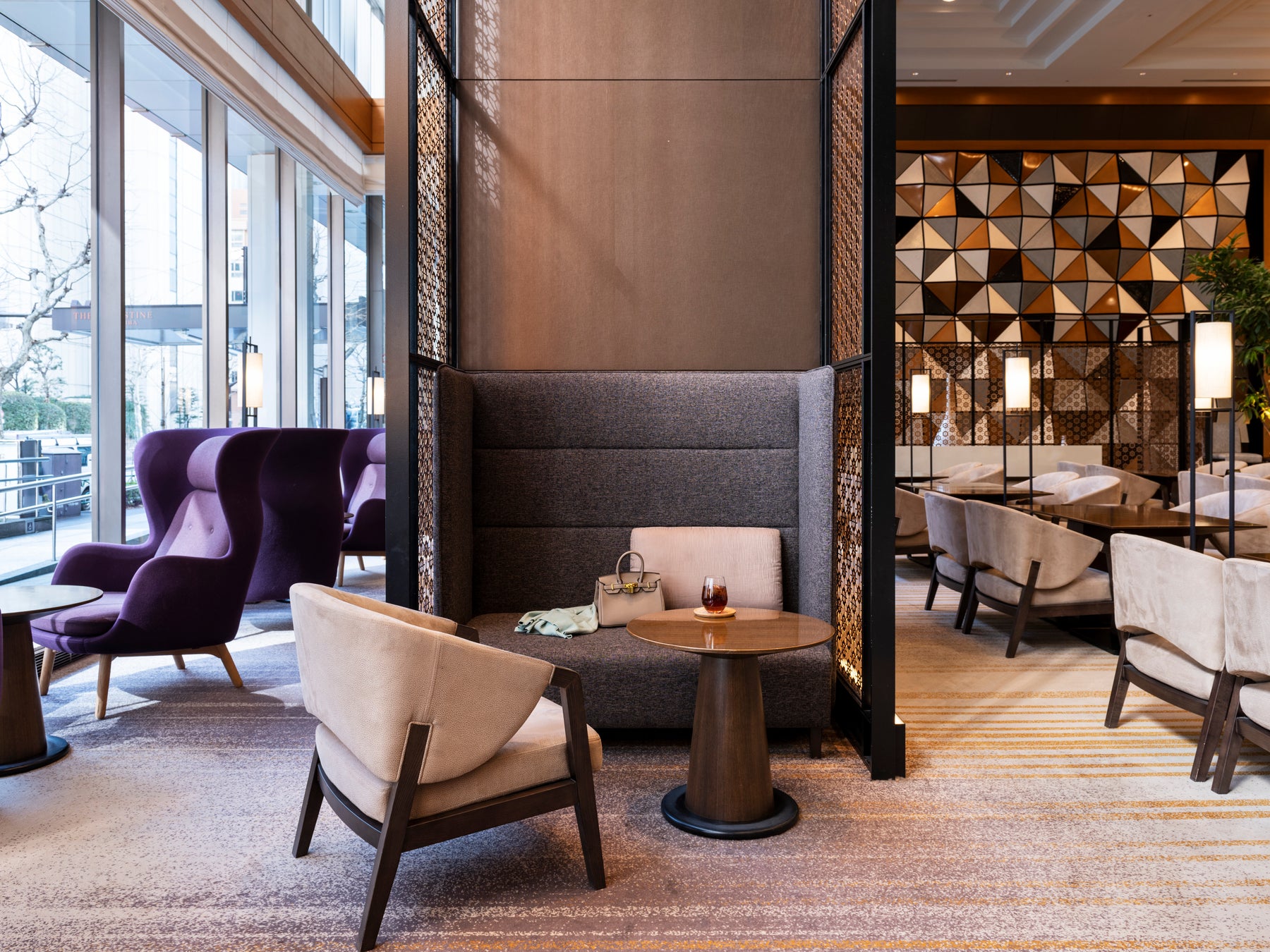 一日の多彩なシーンに合わせてご利用いただけるラウンジ。江戸小紋の桜亀甲紋や薩摩家紋を取り入れた「KOMMON SCREEN」、切子細工を表現した「KIRIKO WALL」など、土地の歴史を感じさせる粋なインテリアが、都会のひとときを優雅に演出します。