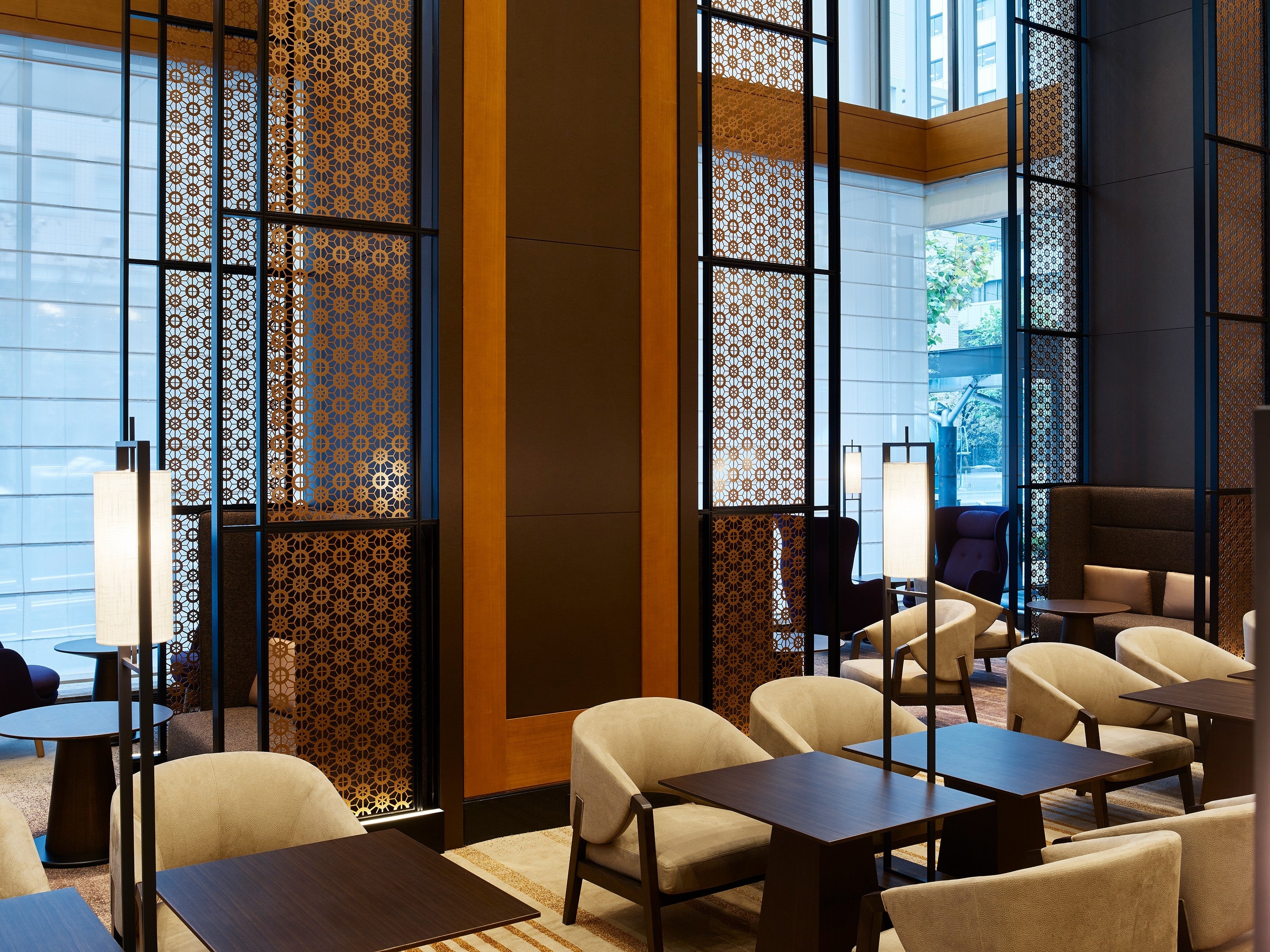 一日の多彩なシーンに合わせてご利用いただけるラウンジ。江戸小紋の桜亀甲紋や薩摩家紋を取り入れた「KOMMON SCREEN」、切子細工を表現した「KIRIKO WALL」など、土地の歴史を感じさせる粋なインテリアが、都会のひとときを優雅に演出します。